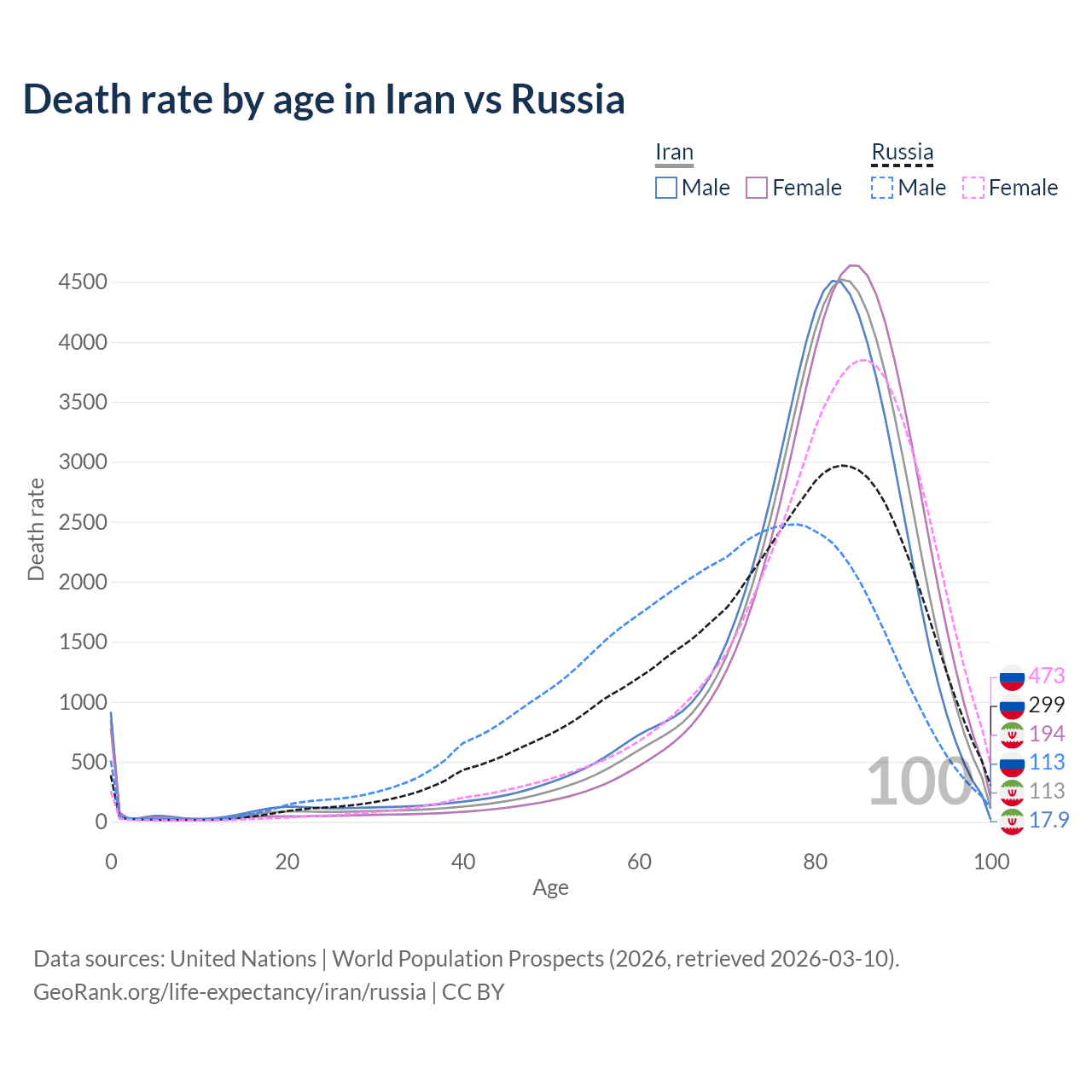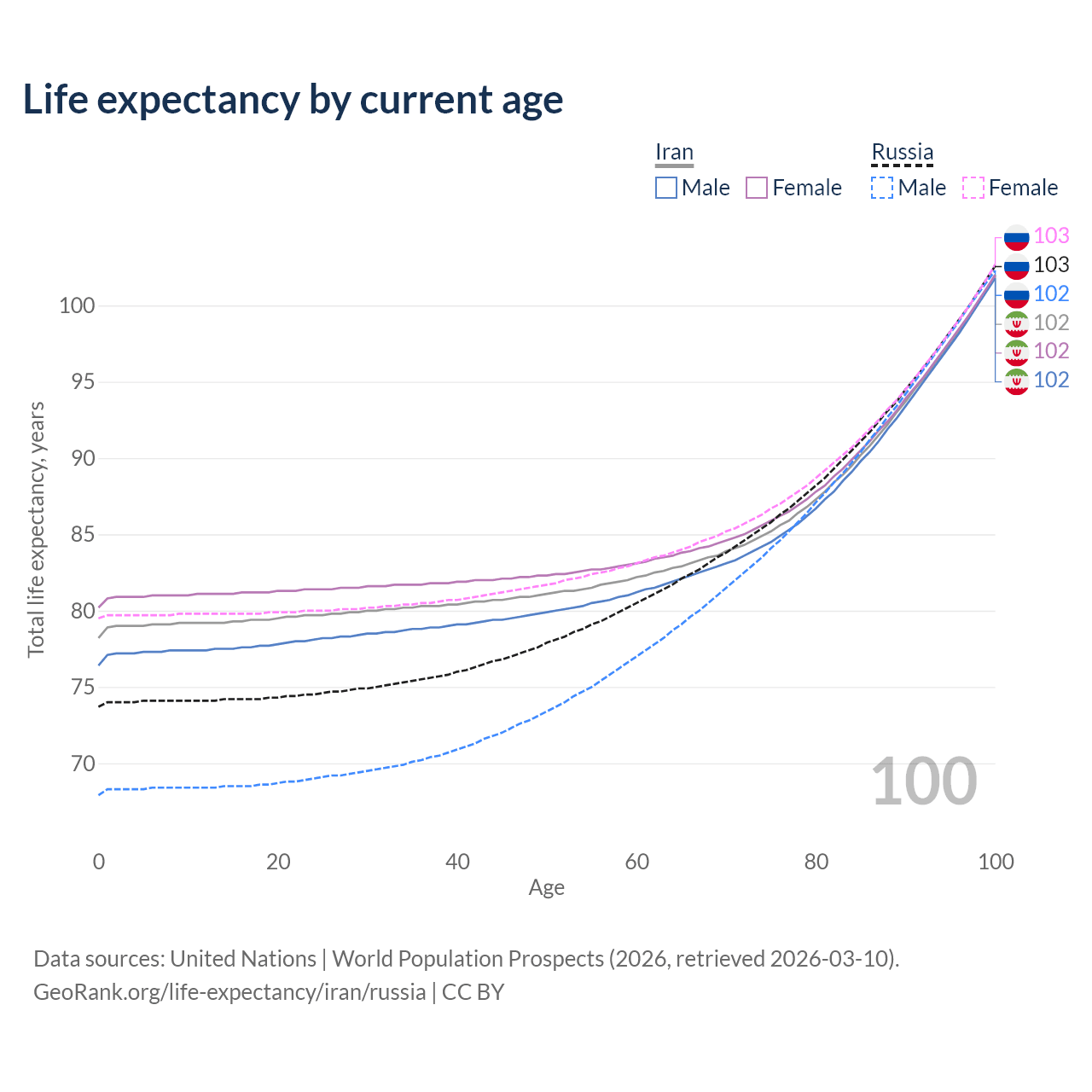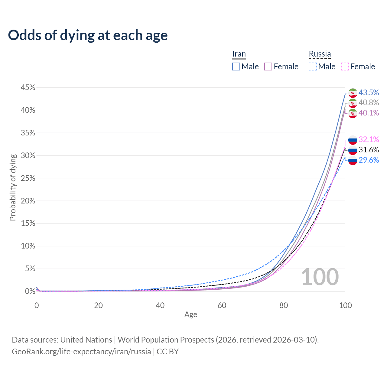 This life expectancy calculator shows the odds of living to 100, 95, 90, and below based on current age for both males and females in Iran and Russia, along with mean and median age of death. The calculations are based on the 2026 life tables (actuarial tables) from the UN World Population Prospects.