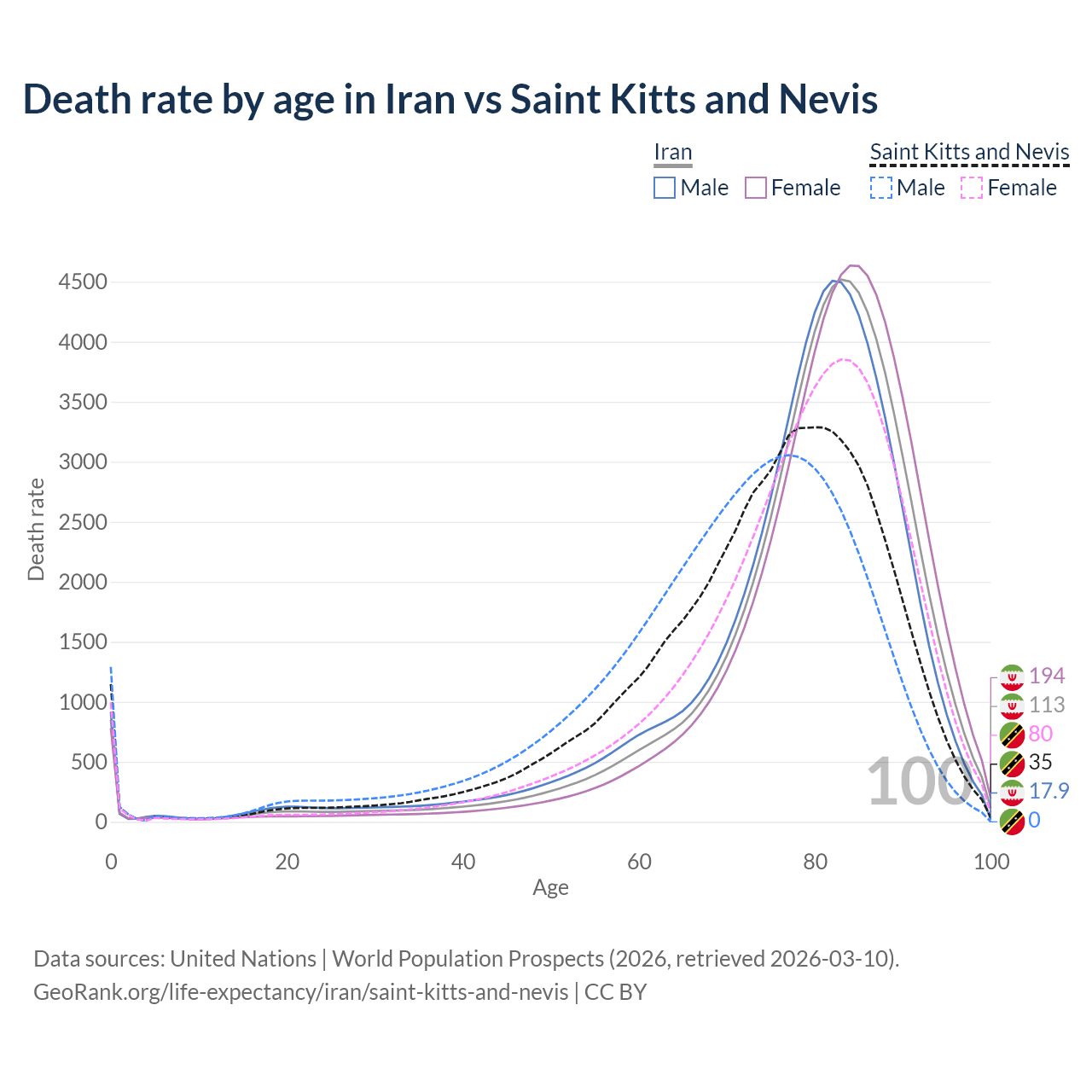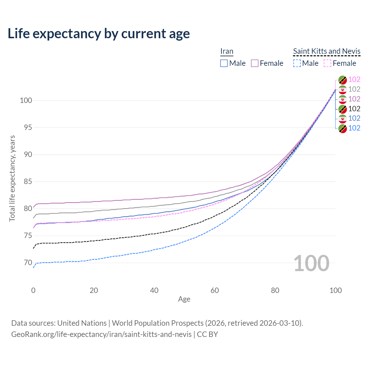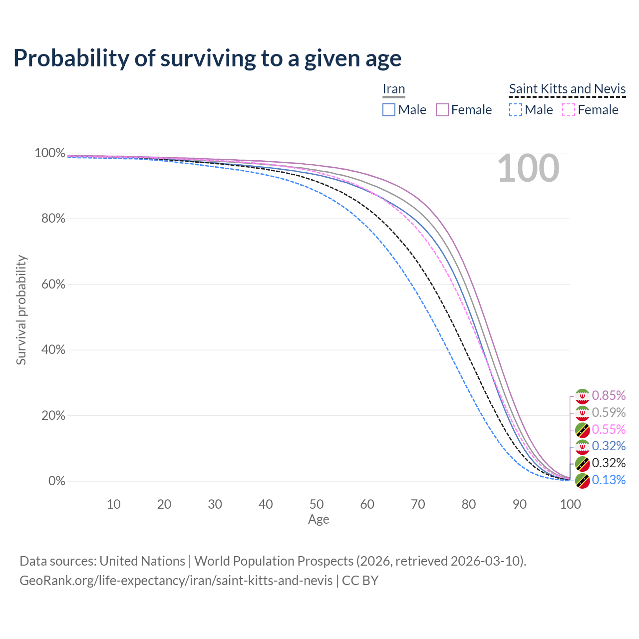 This life expectancy calculator shows the odds of living to 100, 95, 90, and below based on current age for both males and females in Iran and Saint Kitts and Nevis, along with mean and median age of death. The calculations are based on the 2026 life tables (actuarial tables) from the UN World Population Prospects.