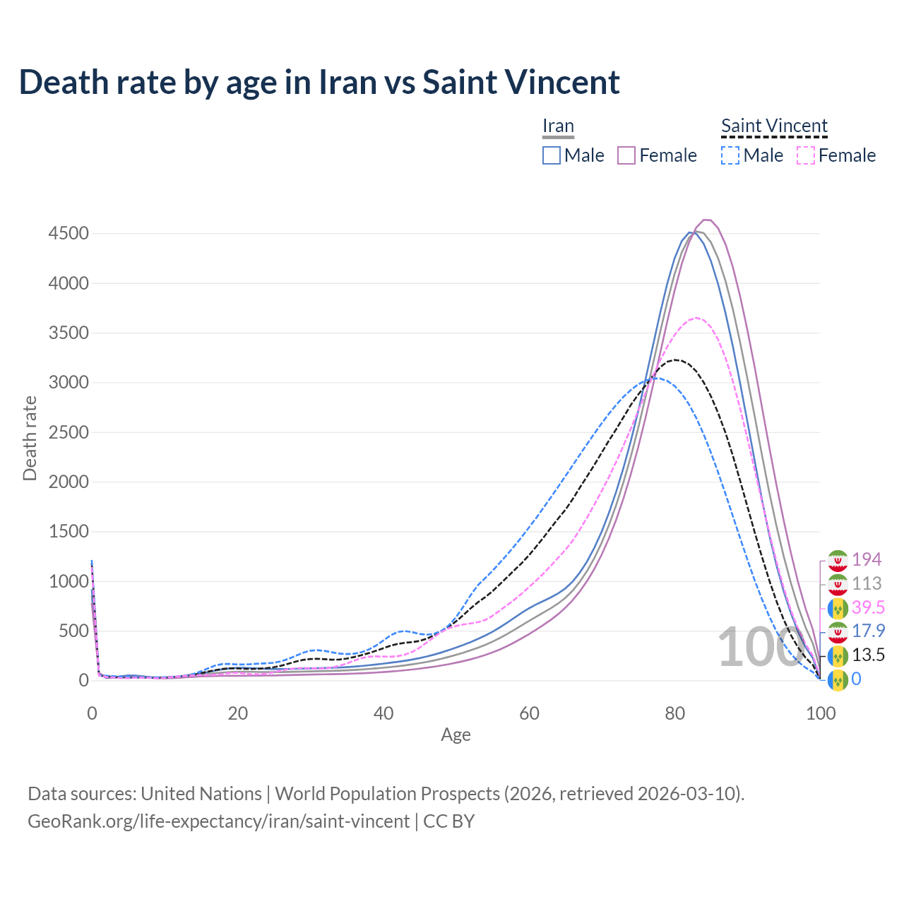 In Iran, the most common age of death is 83, compared to 80 in Saint Vincent. The median age of death is 81.8 in Iran and 75.6 in Saint Vincent, meaning only half of each cohort is expected to live past that age.