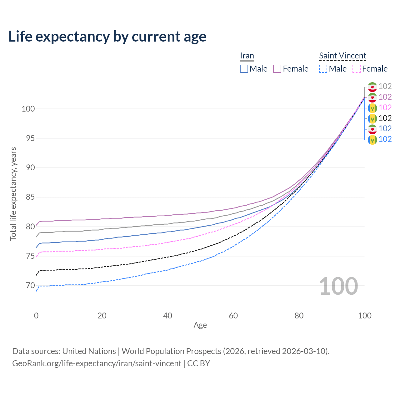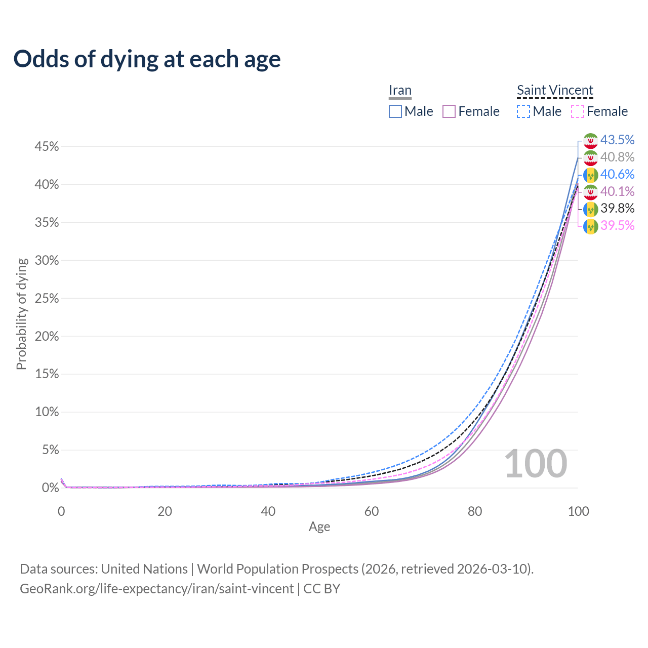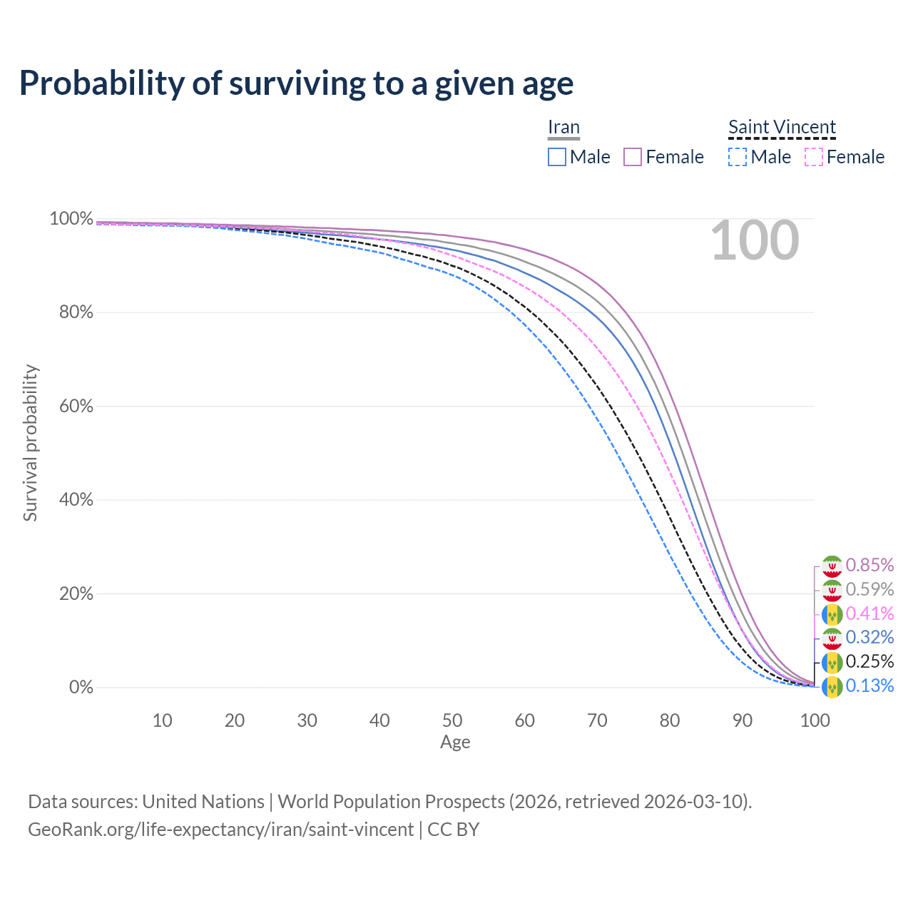 This life expectancy calculator shows the odds of living to 100, 95, 90, and below based on current age for both males and females in Iran and Saint Vincent, along with mean and median age of death. The calculations are based on the 2026 life tables (actuarial tables) from the UN World Population Prospects.