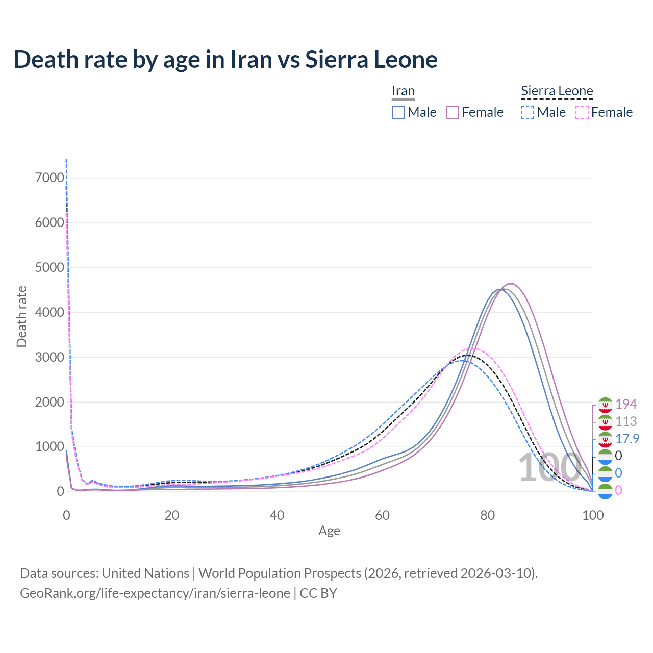 In Iran, the most common age of death is 83, compared to 0 in Sierra Leone. The median age of death is 81.8 in Iran and 70.8 in Sierra Leone, meaning only half of each cohort is expected to live past that age.