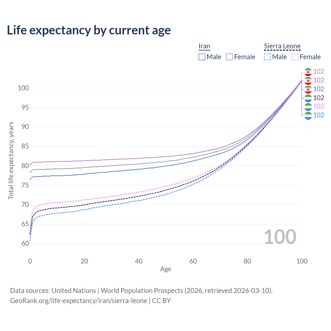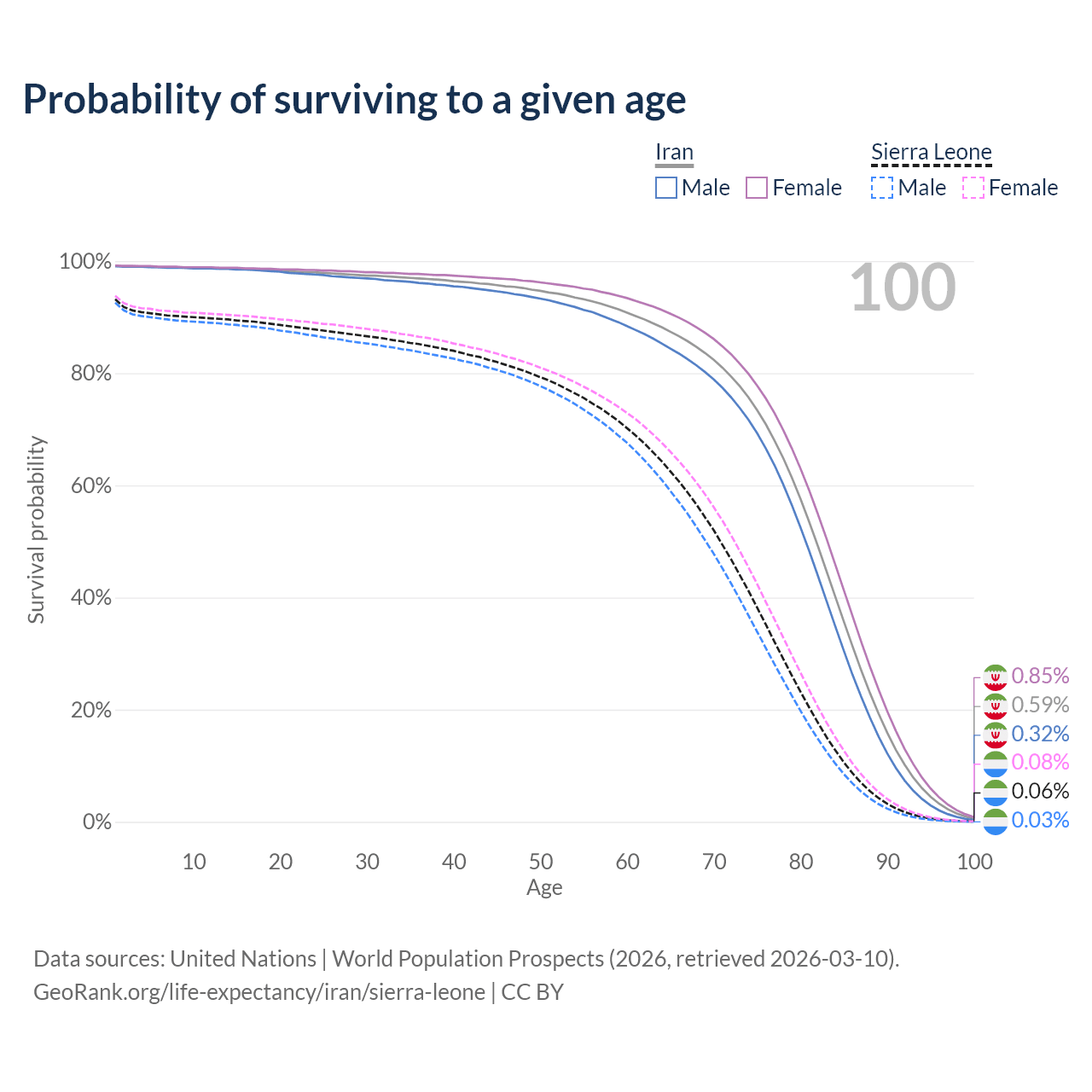 This life expectancy calculator shows the odds of living to 100, 95, 90, and below based on current age for both males and females in Iran and Sierra Leone, along with mean and median age of death. The calculations are based on the 2026 life tables (actuarial tables) from the UN World Population Prospects.