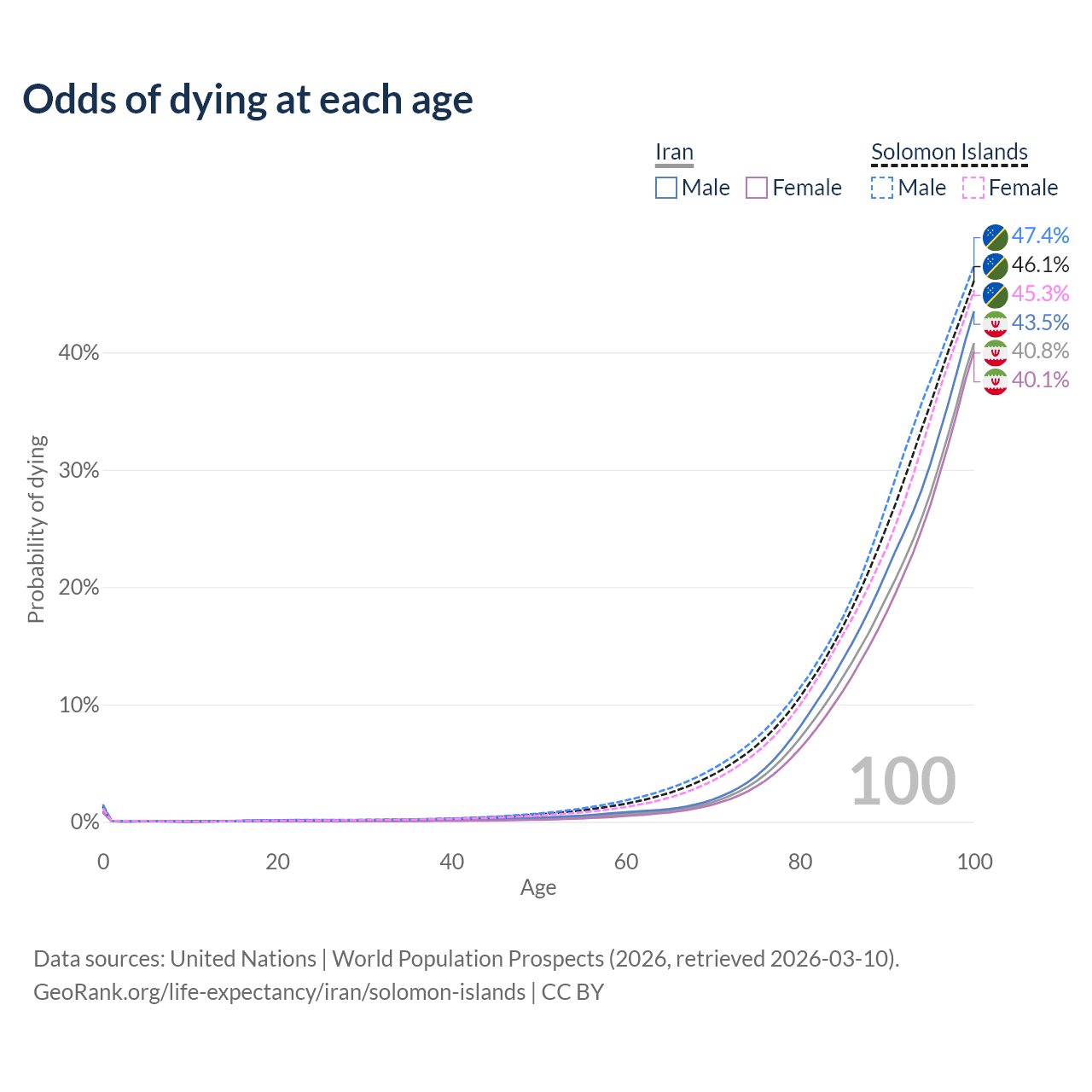 This life expectancy calculator shows the odds of living to 100, 95, 90, and below based on current age for both males and females in Iran and the Solomon Islands, along with mean and median age of death. The calculations are based on the 2026 life tables (actuarial tables) from the UN World Population Prospects.