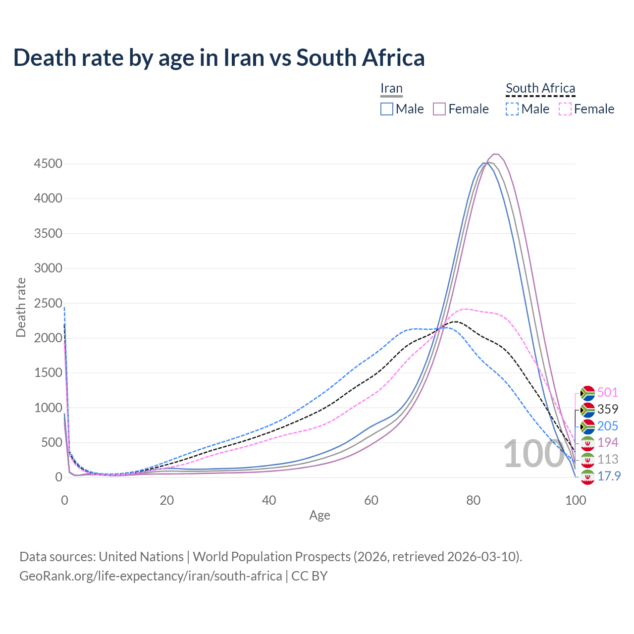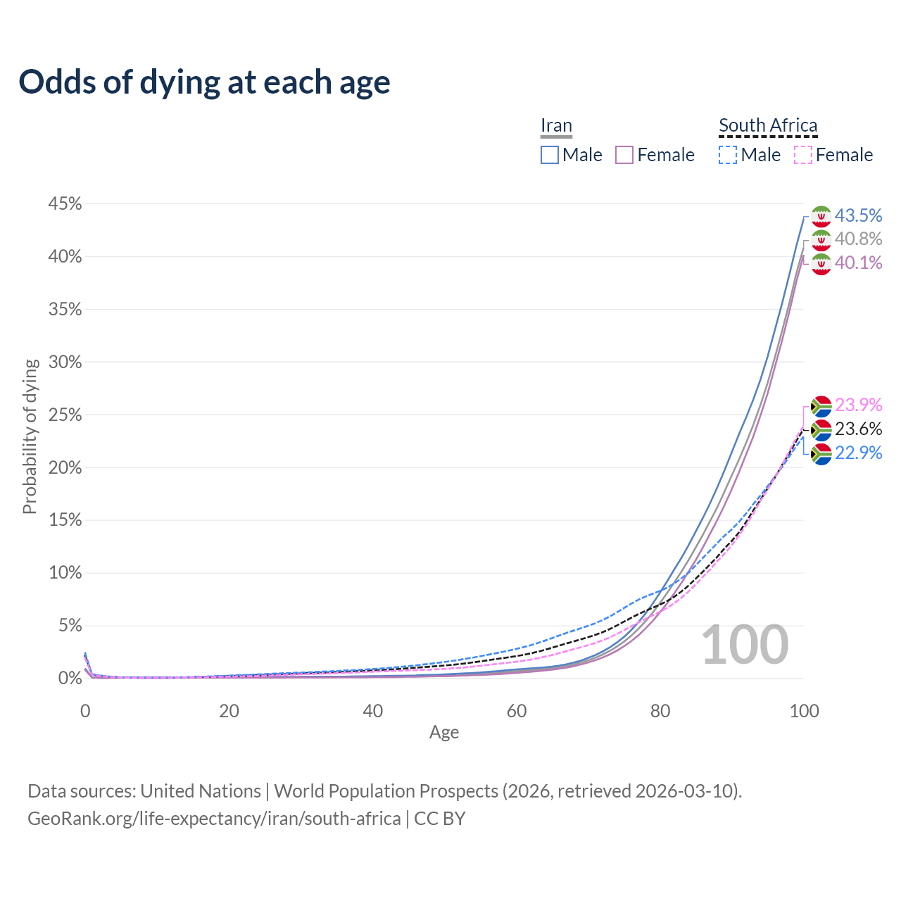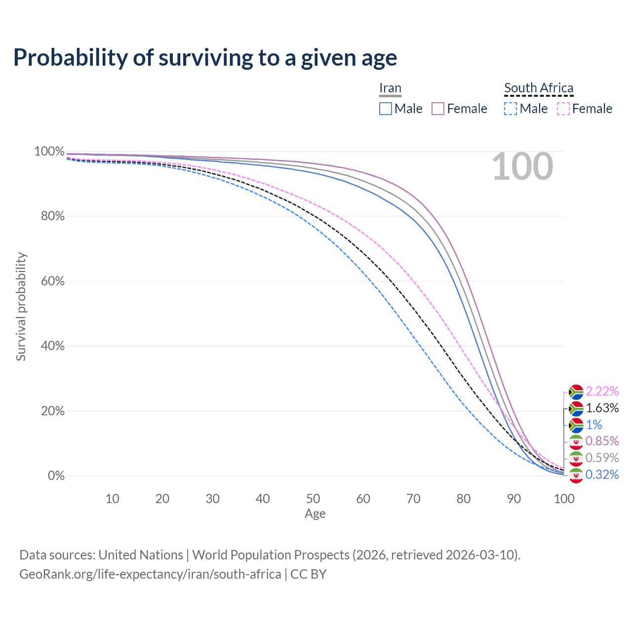 This life expectancy calculator shows the odds of living to 100, 95, 90, and below based on current age for both males and females in Iran and South Africa, along with mean and median age of death. The calculations are based on the 2026 life tables (actuarial tables) from the UN World Population Prospects.