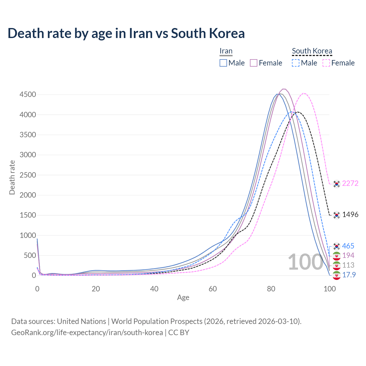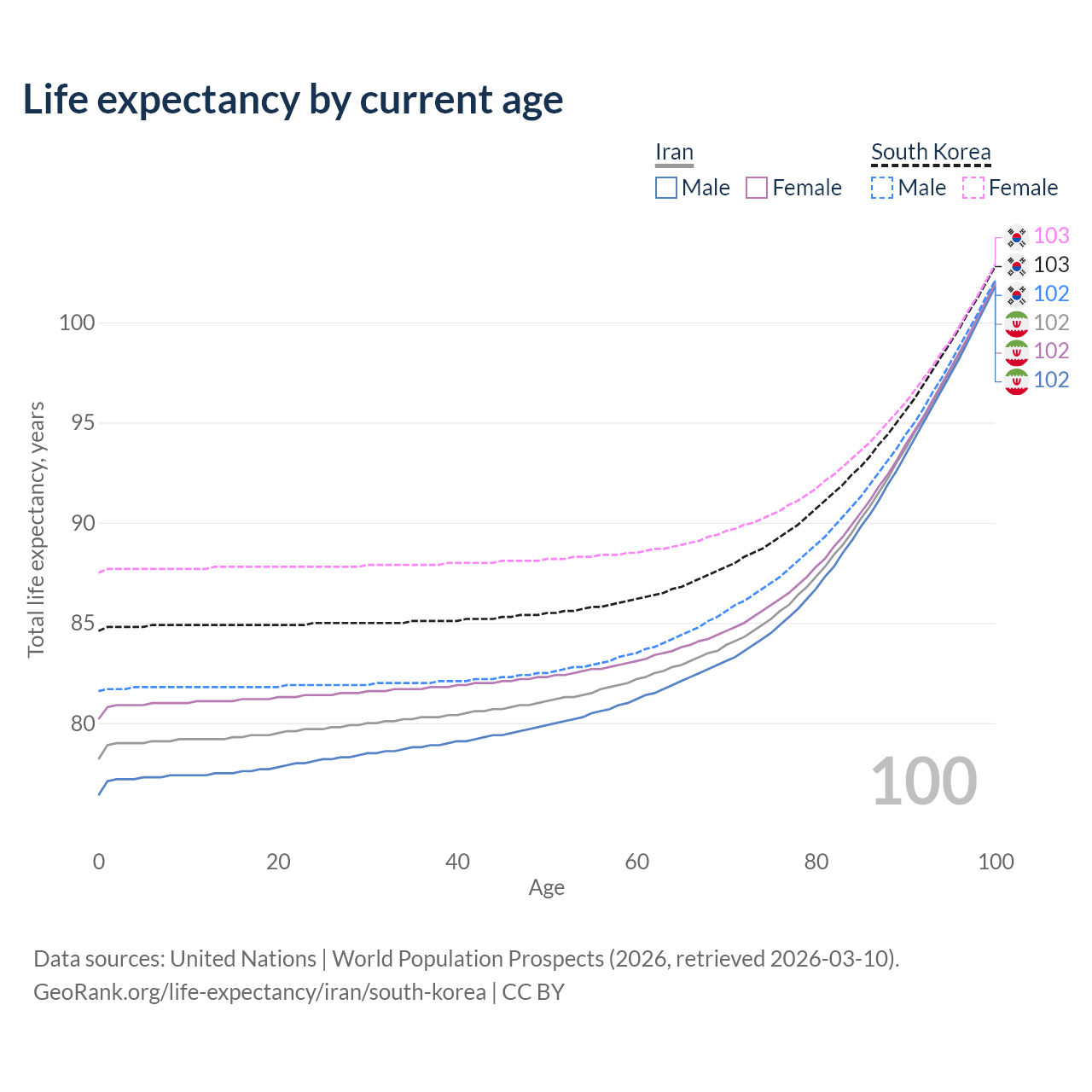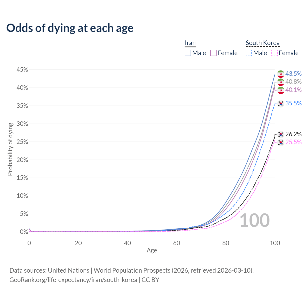This life expectancy calculator shows the odds of living to 100, 95, 90, and below based on current age for both males and females in Iran and South Korea, along with mean and median age of death. The calculations are based on the 2026 life tables (actuarial tables) from the UN World Population Prospects.