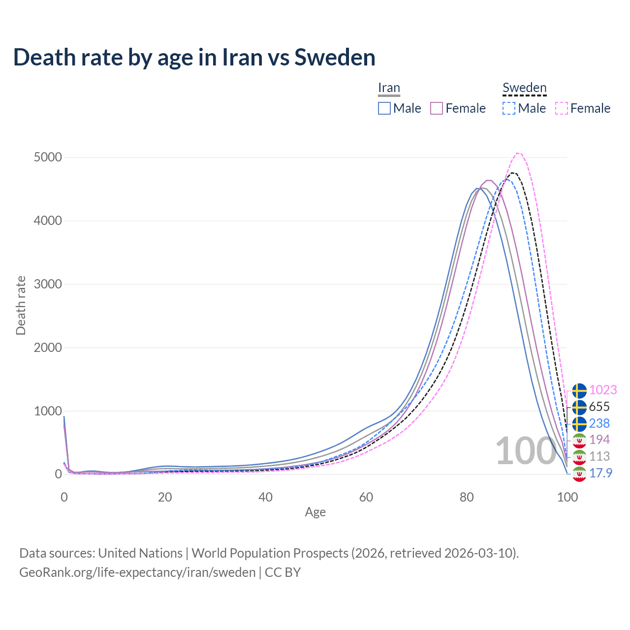 In Iran, the most common age of death is 83, compared to 89 in Sweden. The median age of death is 81.8 in Iran and 86.5 in Sweden, meaning only half of each cohort is expected to live past that age.