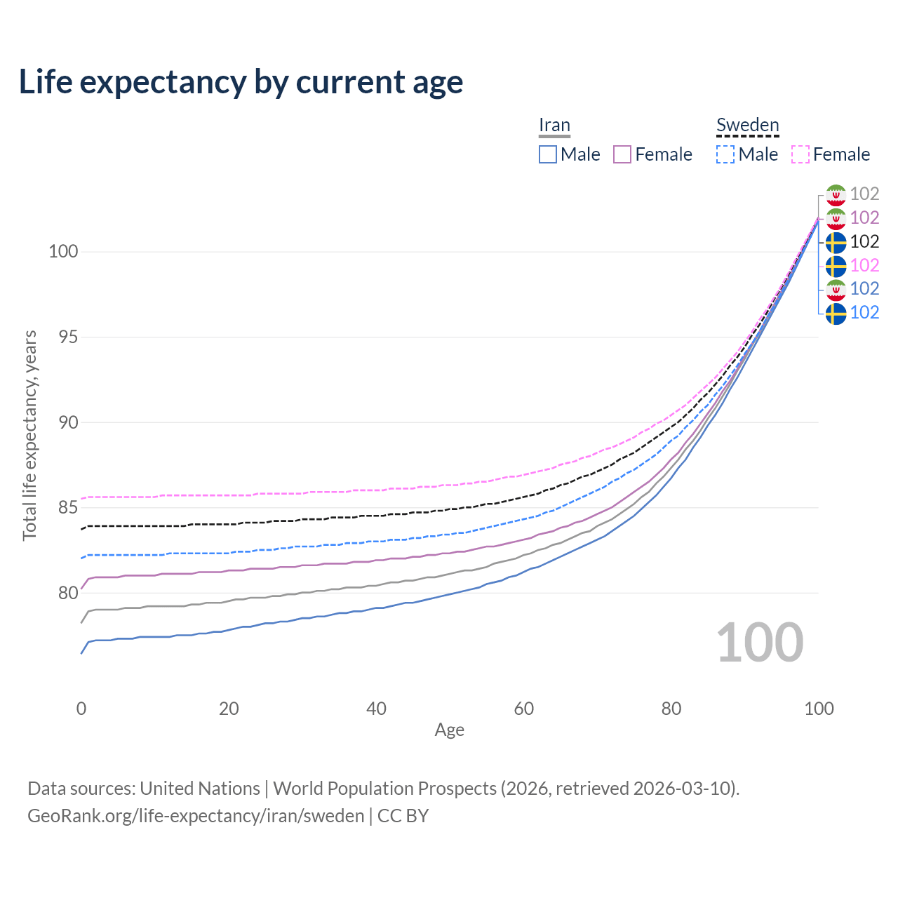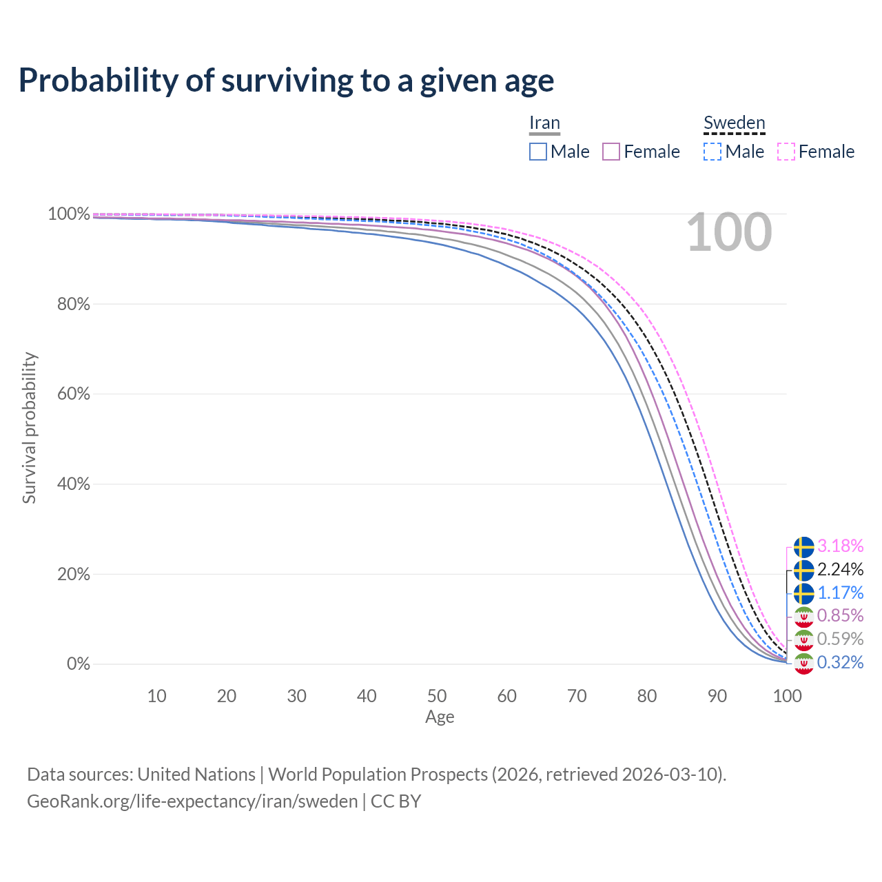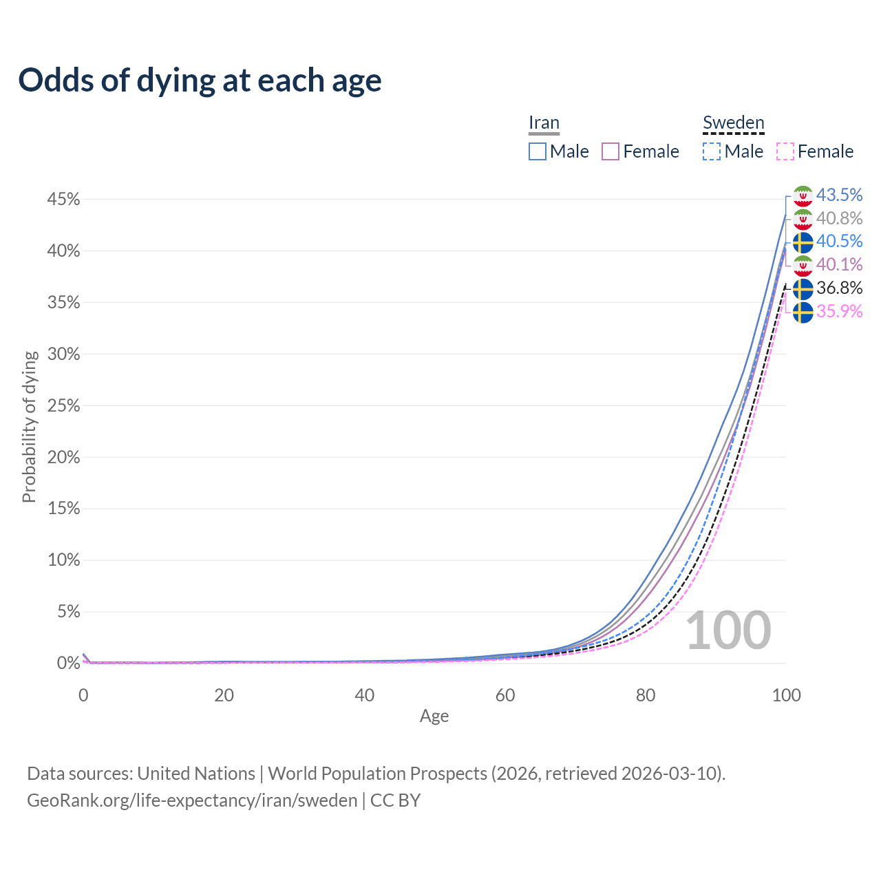 This life expectancy calculator shows the odds of living to 100, 95, 90, and below based on current age for both males and females in Iran and Sweden, along with mean and median age of death. The calculations are based on the 2026 life tables (actuarial tables) from the UN World Population Prospects.
