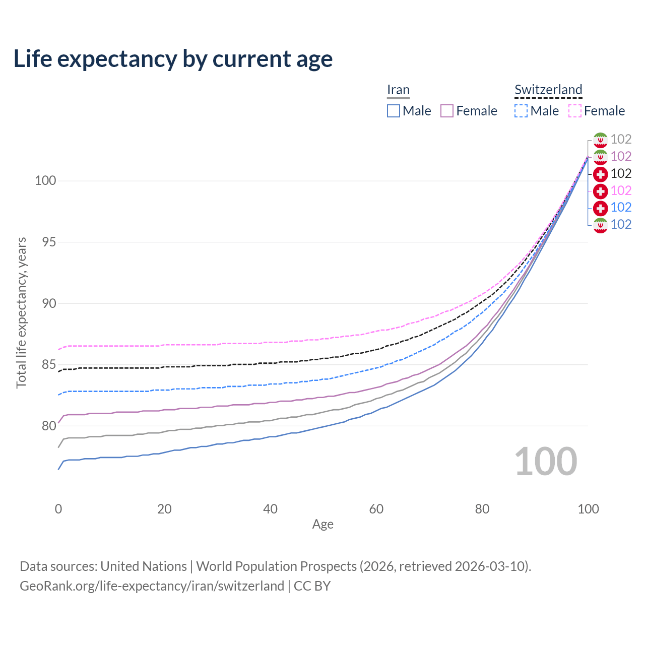 This life expectancy calculator shows the odds of living to 100, 95, 90, and below based on current age for both males and females in Iran and Switzerland, along with mean and median age of death. The calculations are based on the 2026 life tables (actuarial tables) from the UN World Population Prospects.