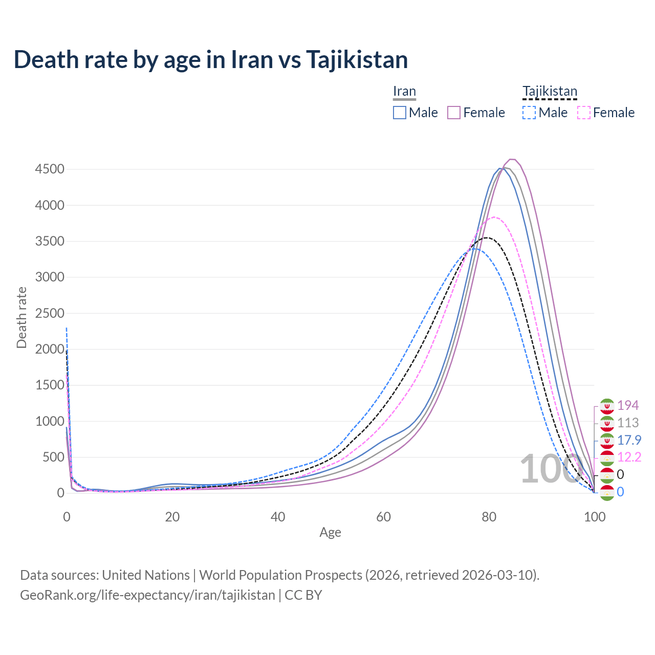 This life expectancy calculator shows the odds of living to 100, 95, 90, and below based on current age for both males and females in Iran and Tajikistan, along with mean and median age of death. The calculations are based on the 2026 life tables (actuarial tables) from the UN World Population Prospects.