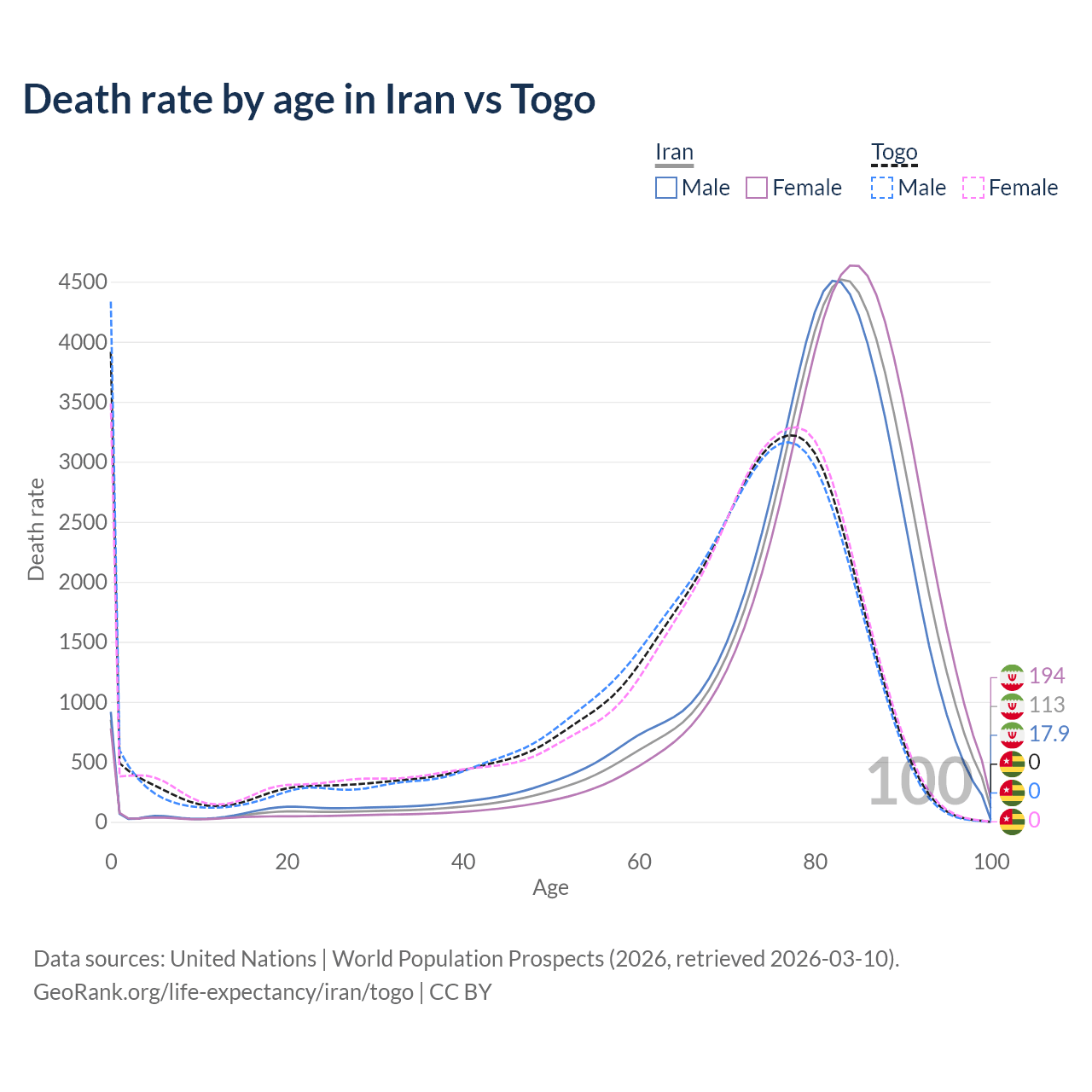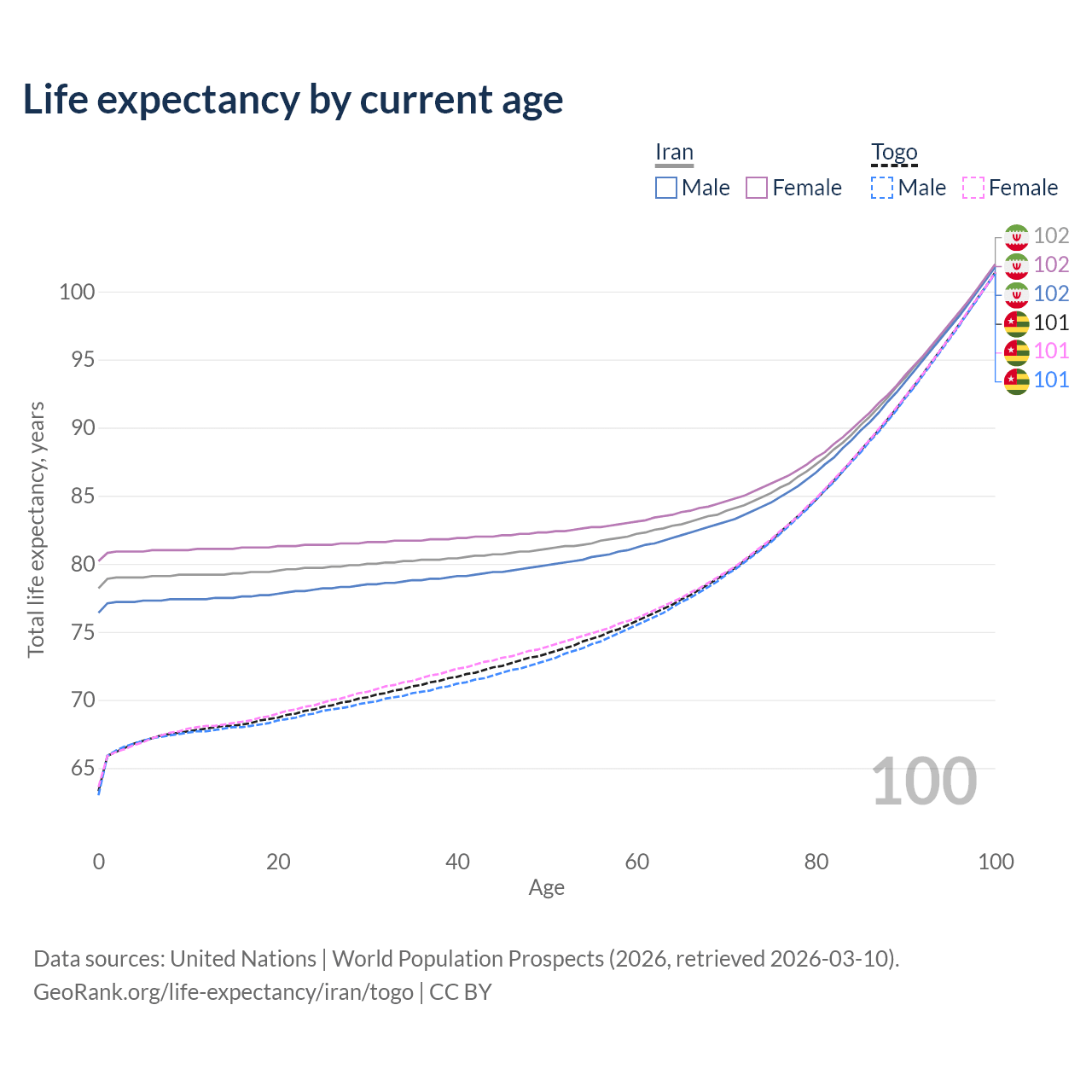 This life expectancy calculator shows the odds of living to 100, 95, 90, and below based on current age for both males and females in Iran and Togo, along with mean and median age of death. The calculations are based on the 2026 life tables (actuarial tables) from the UN World Population Prospects.