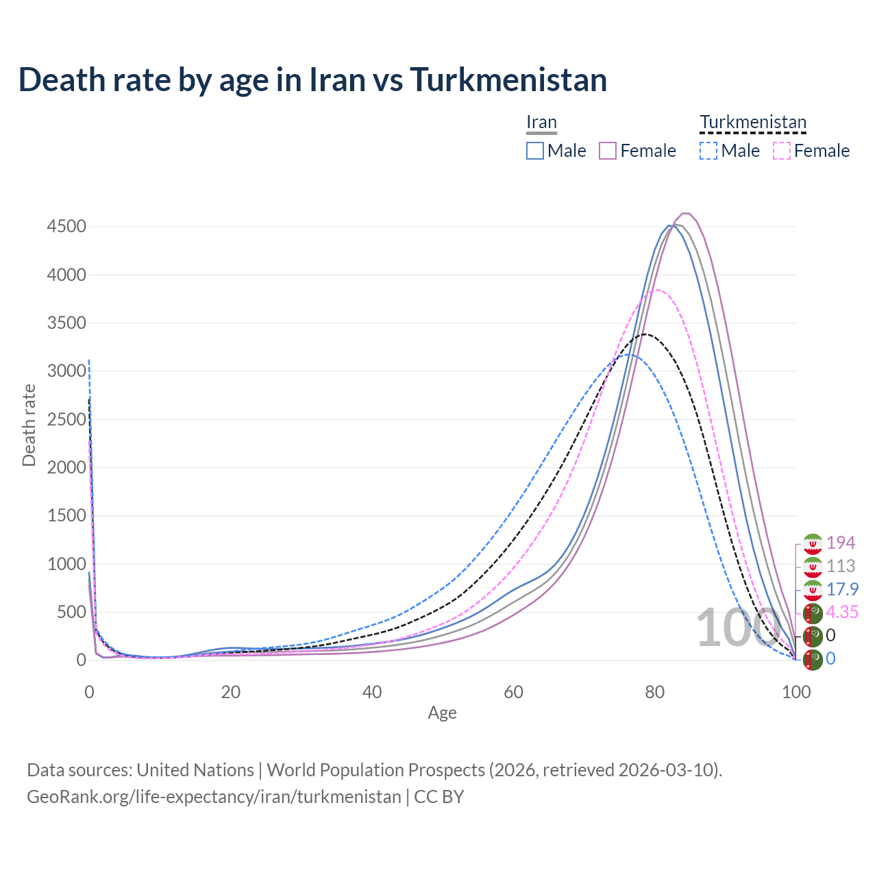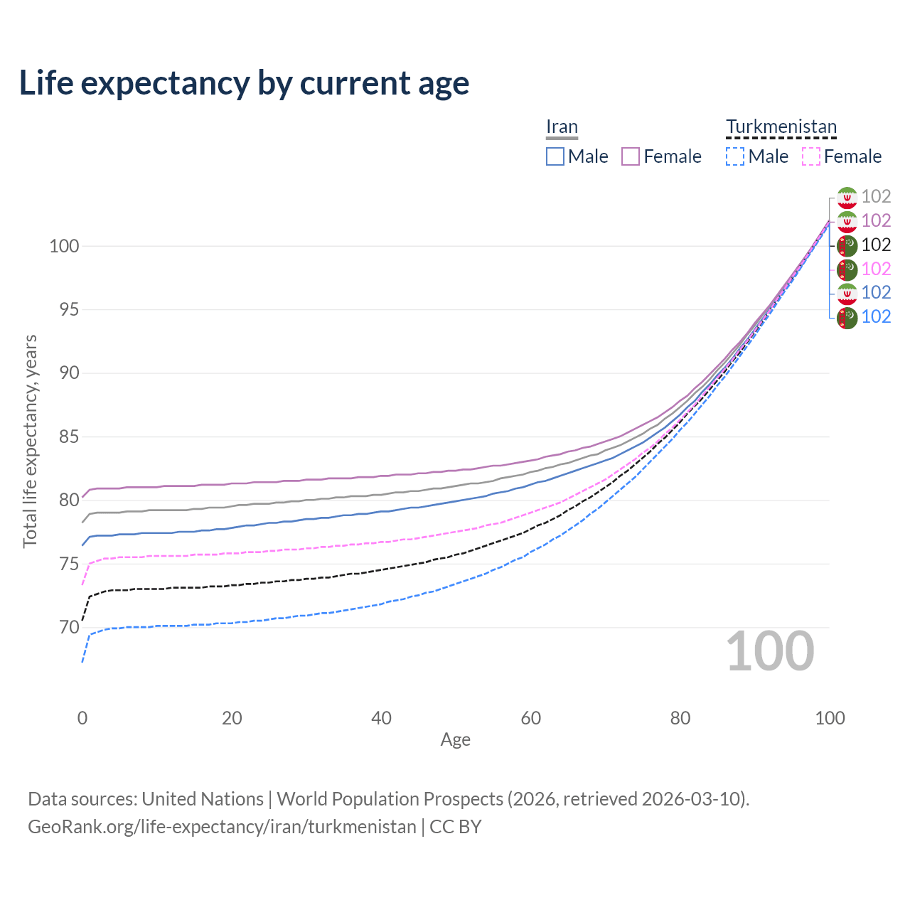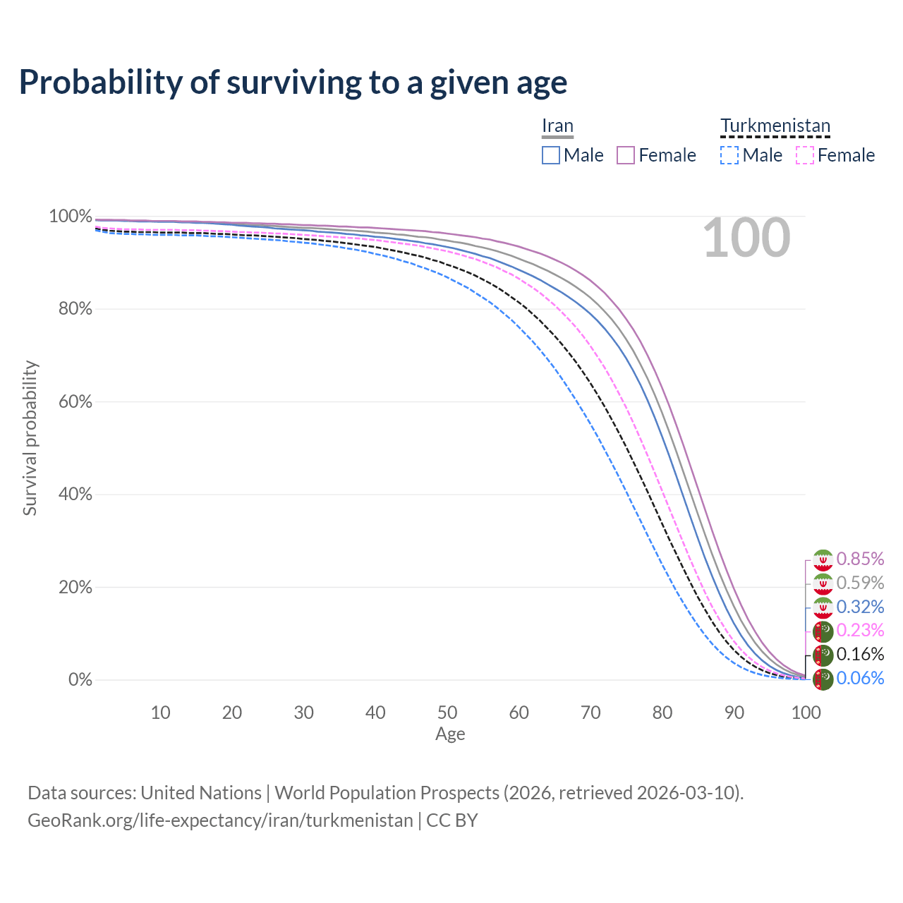 This life expectancy calculator shows the odds of living to 100, 95, 90, and below based on current age for both males and females in Iran and Turkmenistan, along with mean and median age of death. The calculations are based on the 2026 life tables (actuarial tables) from the UN World Population Prospects.