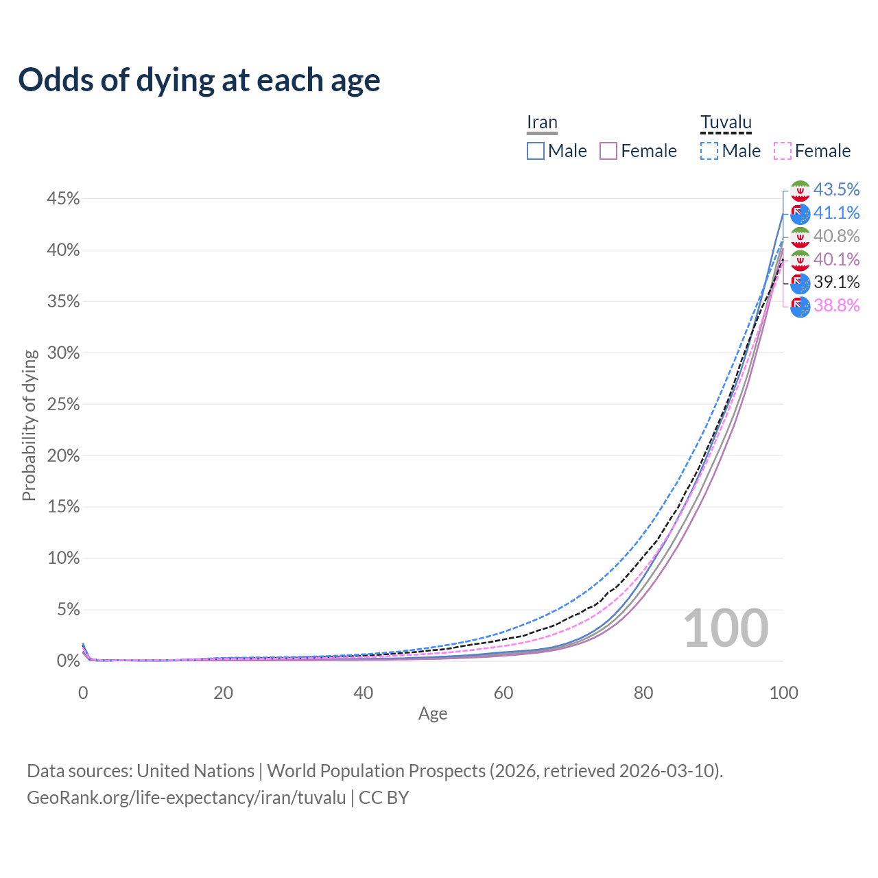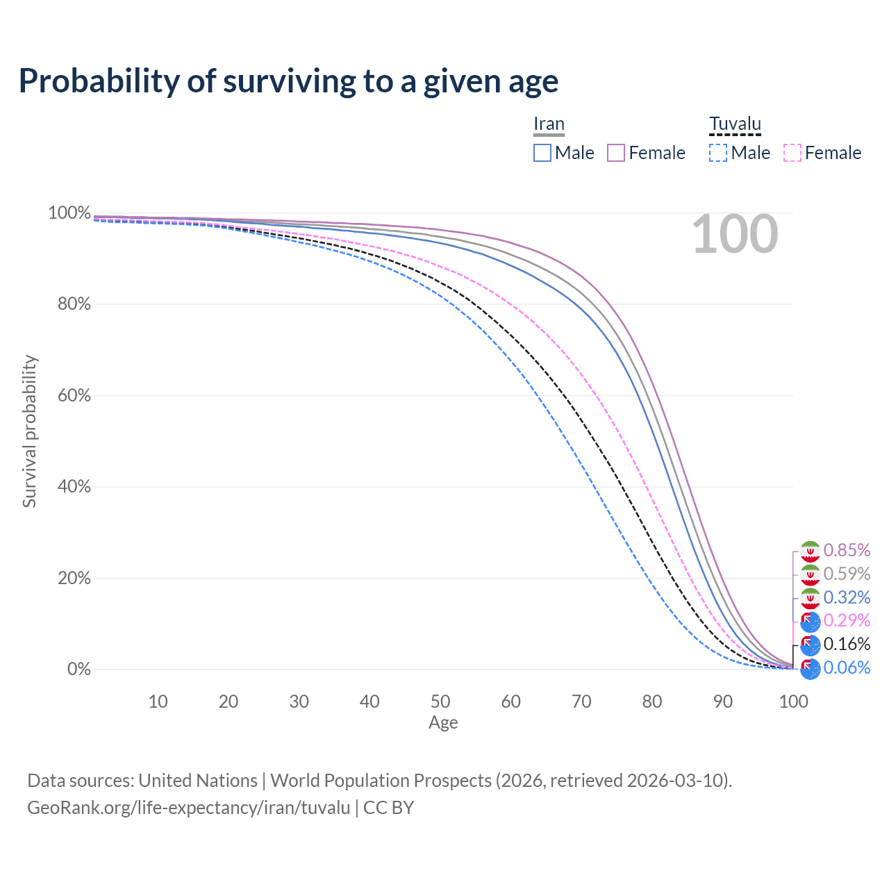 This life expectancy calculator shows the odds of living to 100, 95, 90, and below based on current age for both males and females in Iran and Tuvalu, along with mean and median age of death. The calculations are based on the 2026 life tables (actuarial tables) from the UN World Population Prospects.