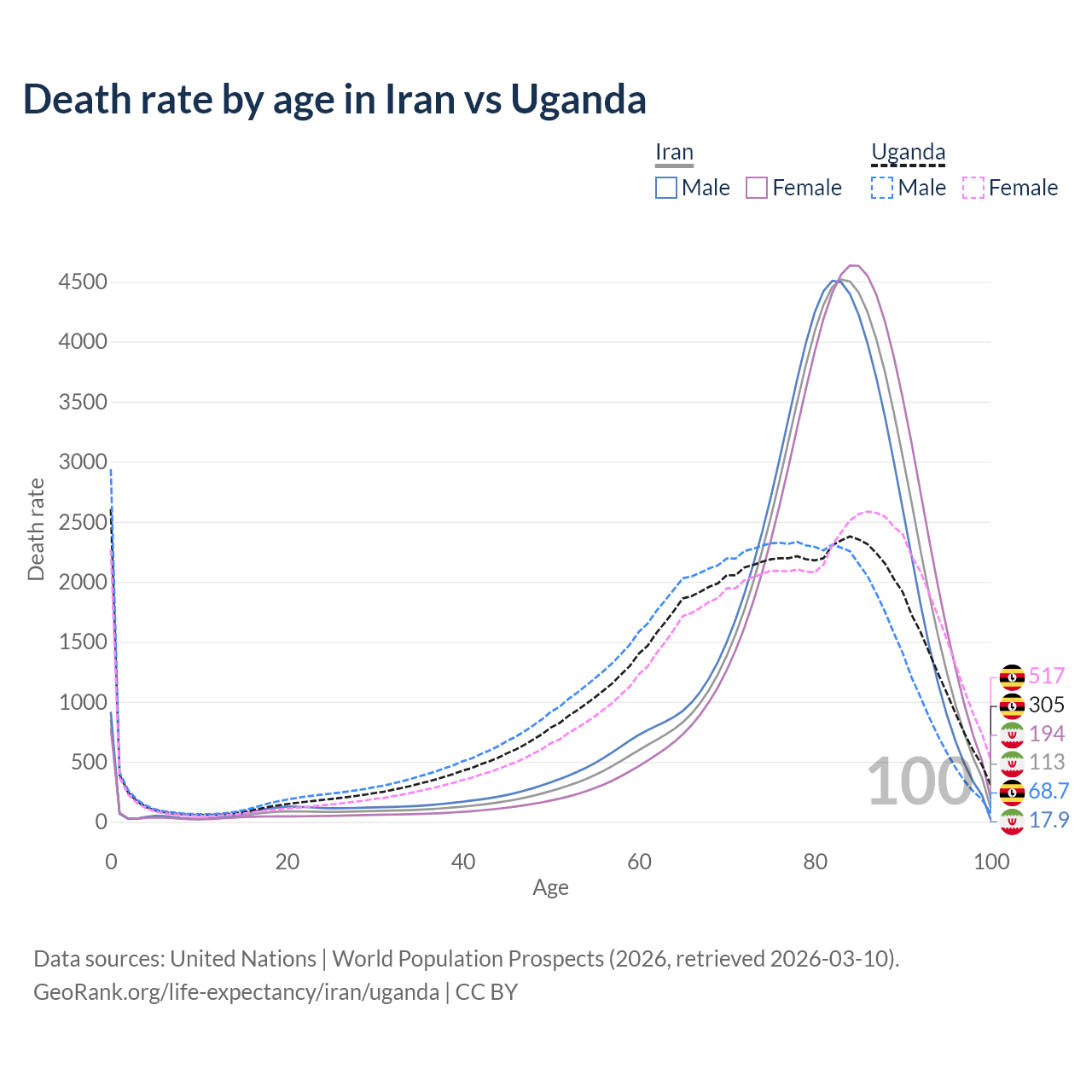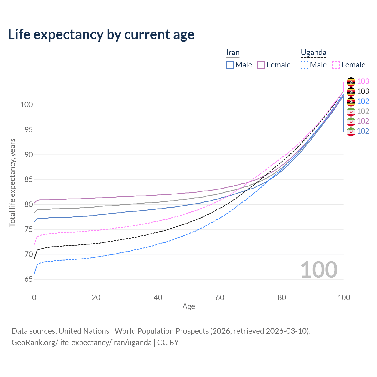 This life expectancy calculator shows the odds of living to 100, 95, 90, and below based on current age for both males and females in Iran and Uganda, along with mean and median age of death. The calculations are based on the 2026 life tables (actuarial tables) from the UN World Population Prospects.