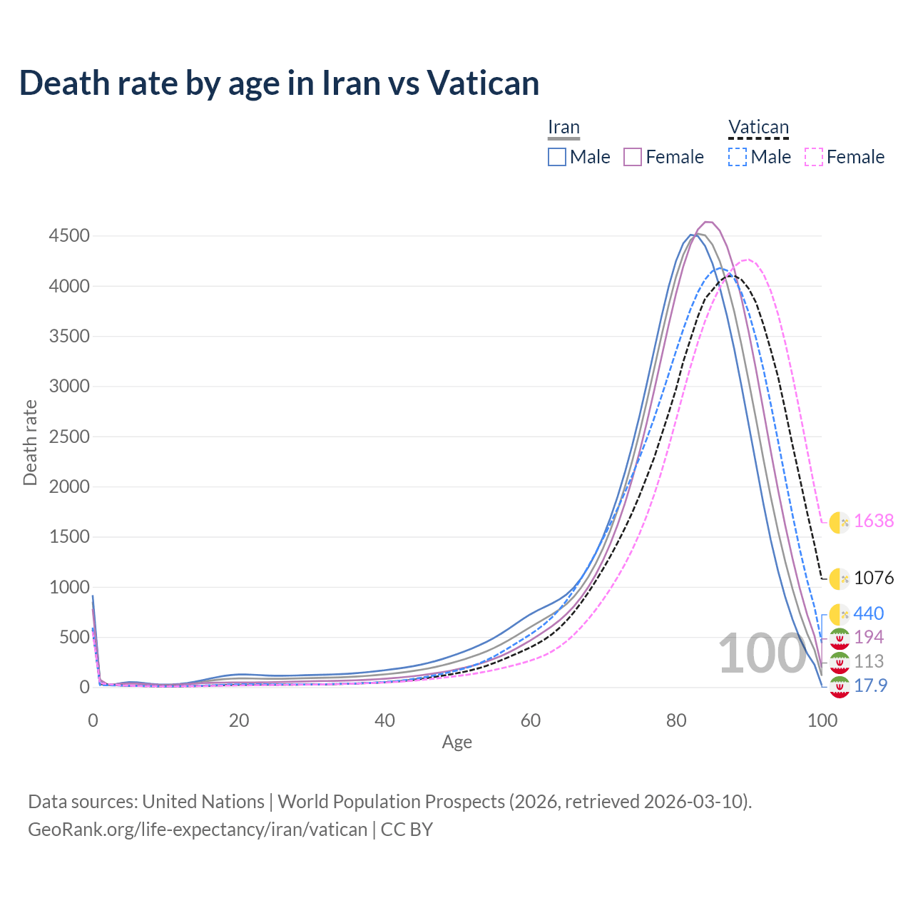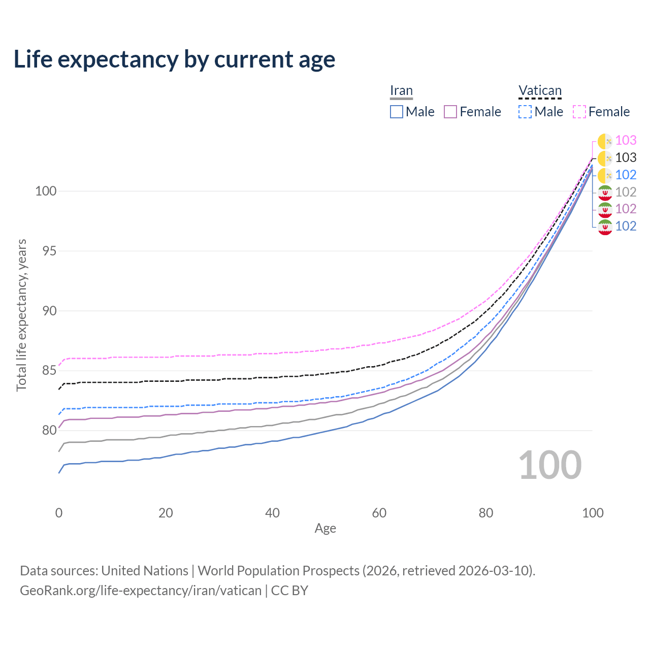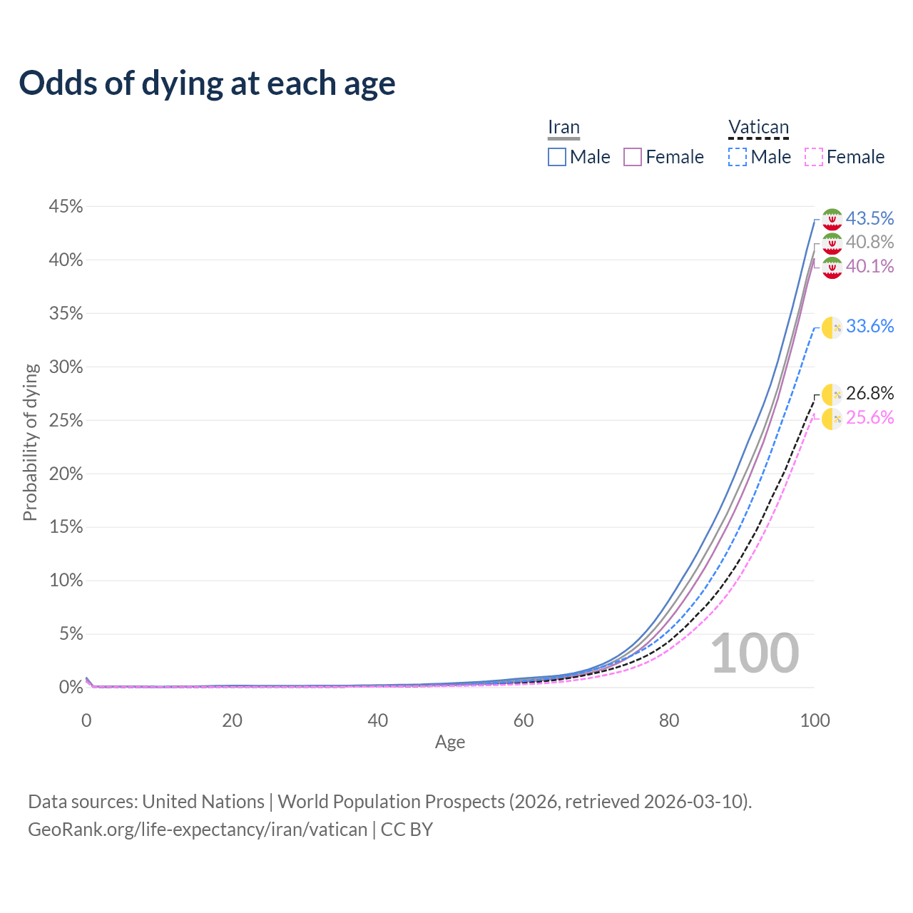 This life expectancy calculator shows the odds of living to 100, 95, 90, and below based on current age for both males and females in Iran and the Vatican, along with mean and median age of death. The calculations are based on the 2026 life tables (actuarial tables) from the UN World Population Prospects.