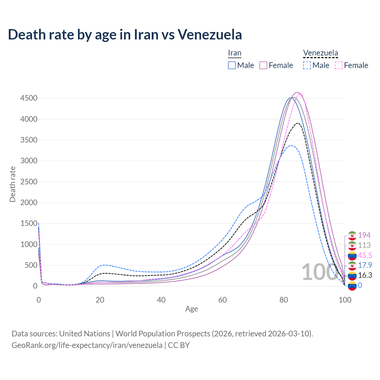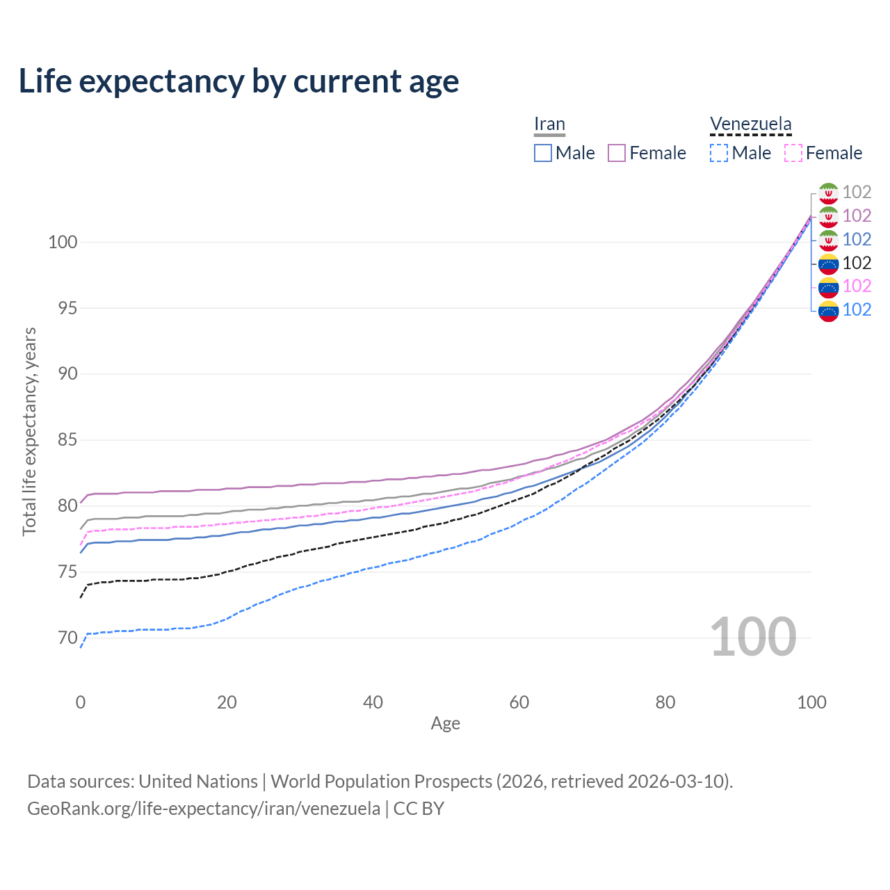This life expectancy calculator shows the odds of living to 100, 95, 90, and below based on current age for both males and females in Iran and Venezuela, along with mean and median age of death. The calculations are based on the 2026 life tables (actuarial tables) from the UN World Population Prospects.