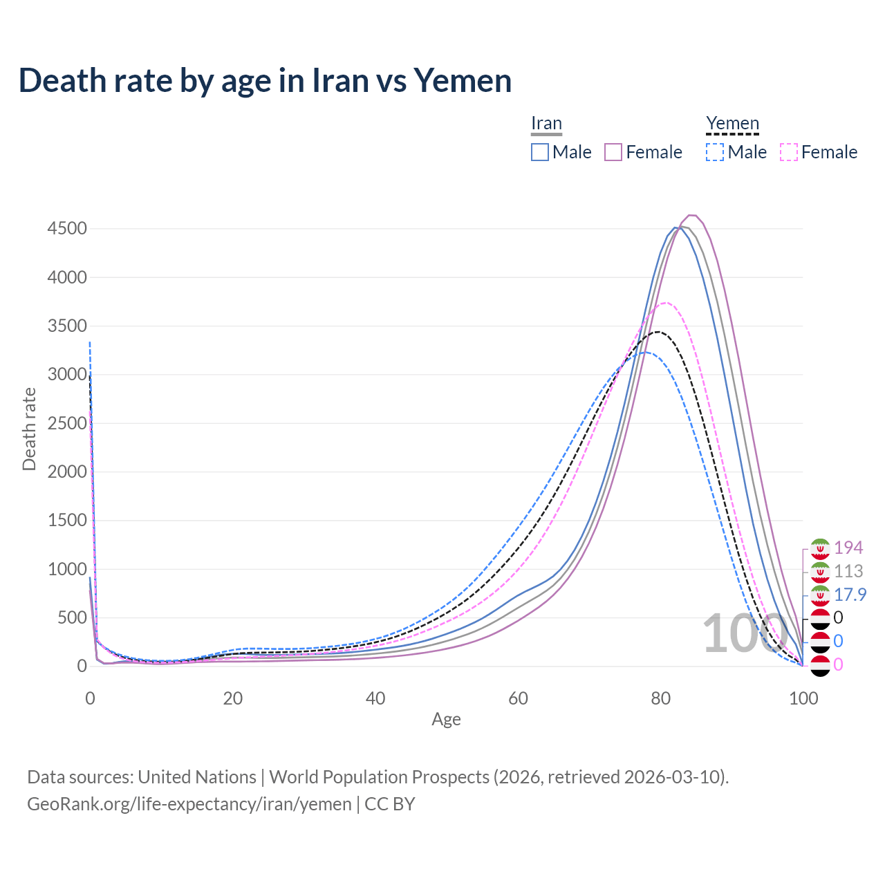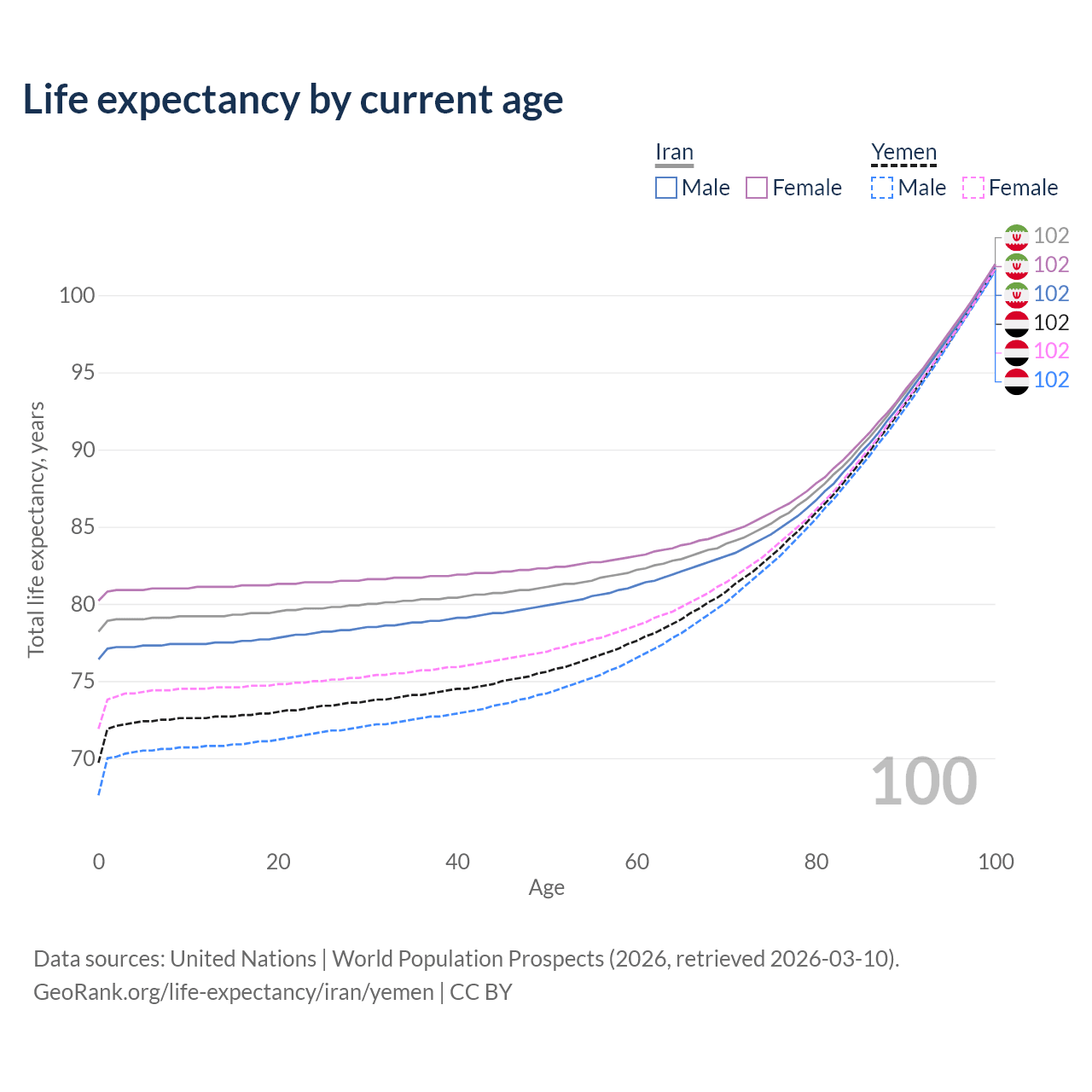 This life expectancy calculator shows the odds of living to 100, 95, 90, and below based on current age for both males and females in Iran and Yemen, along with mean and median age of death. The calculations are based on the 2026 life tables (actuarial tables) from the UN World Population Prospects.