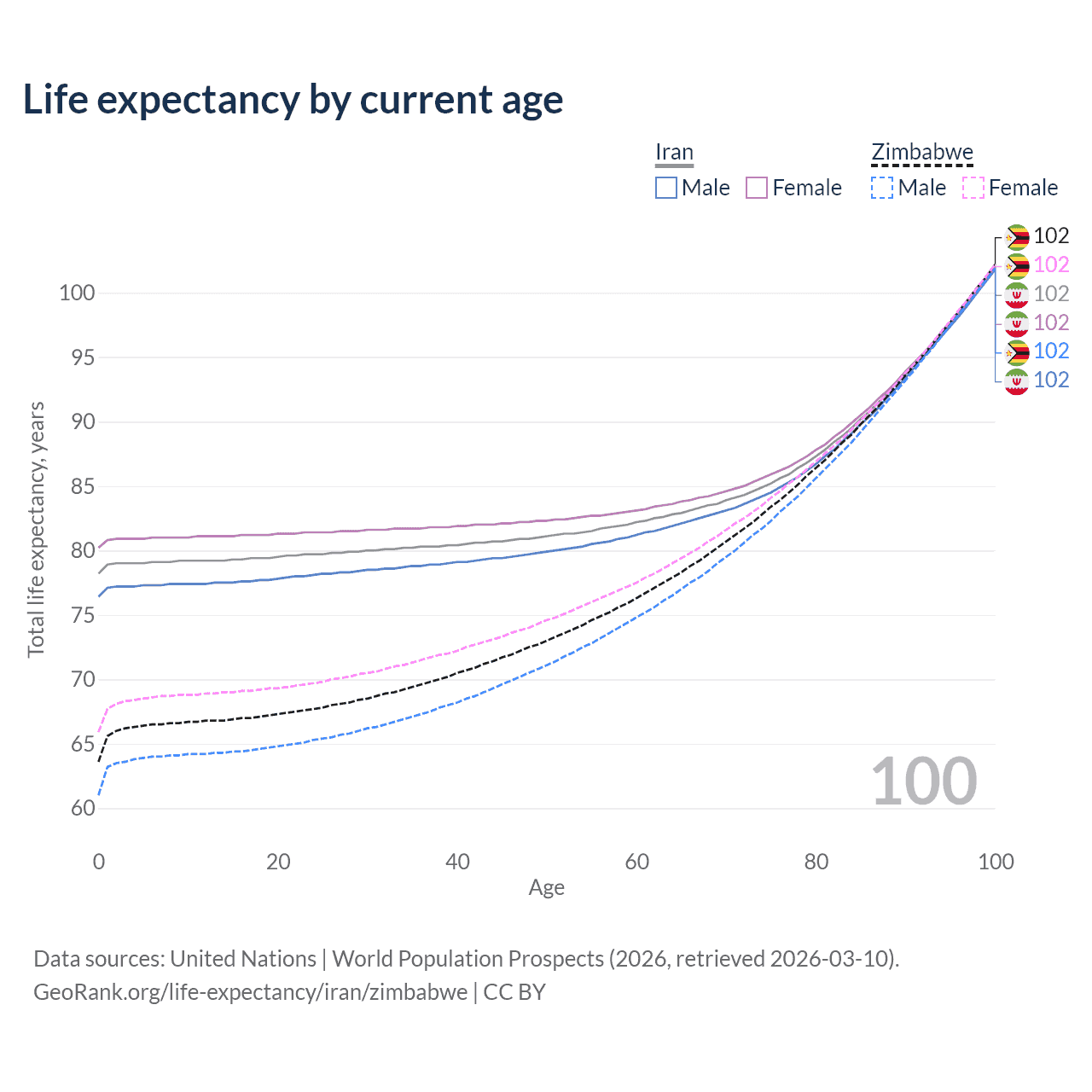 This life expectancy calculator shows the odds of living to 100, 95, 90, and below based on current age for both males and females in Iran and Zimbabwe, along with mean and median age of death. The calculations are based on the 2026 life tables (actuarial tables) from the UN World Population Prospects.