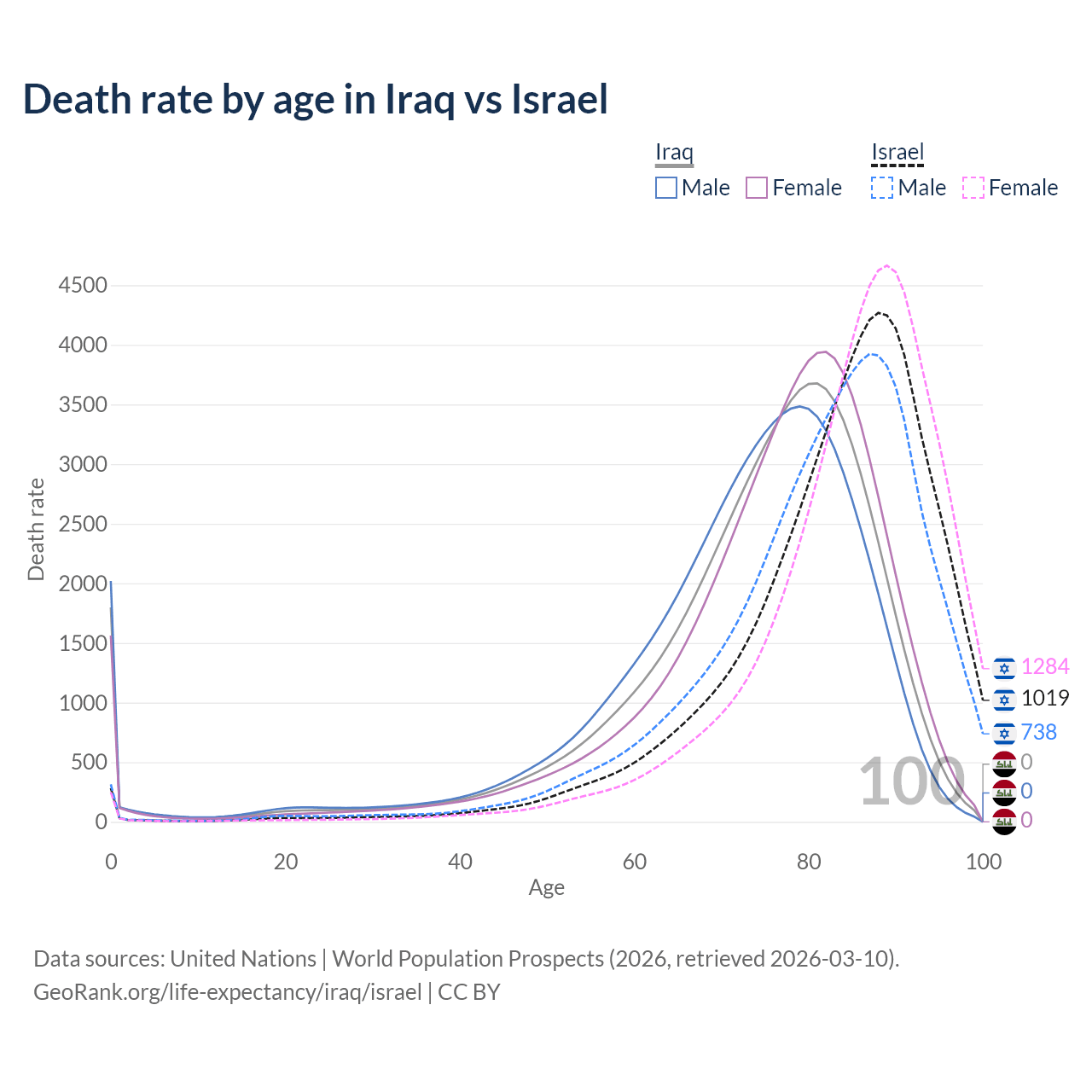 In Iraq, the most common age of death is 81, compared to 88 in Israel. The median age of death is 76.7 in Iraq and 85.6 in Israel, meaning only half of each cohort is expected to live past that age.