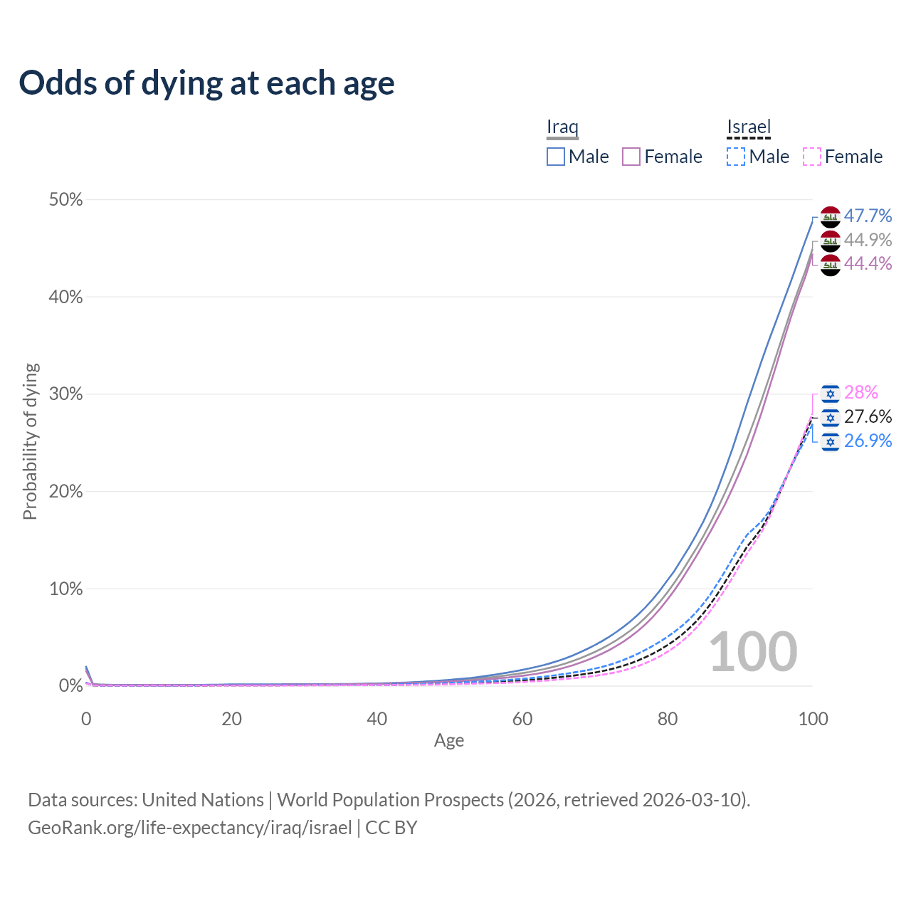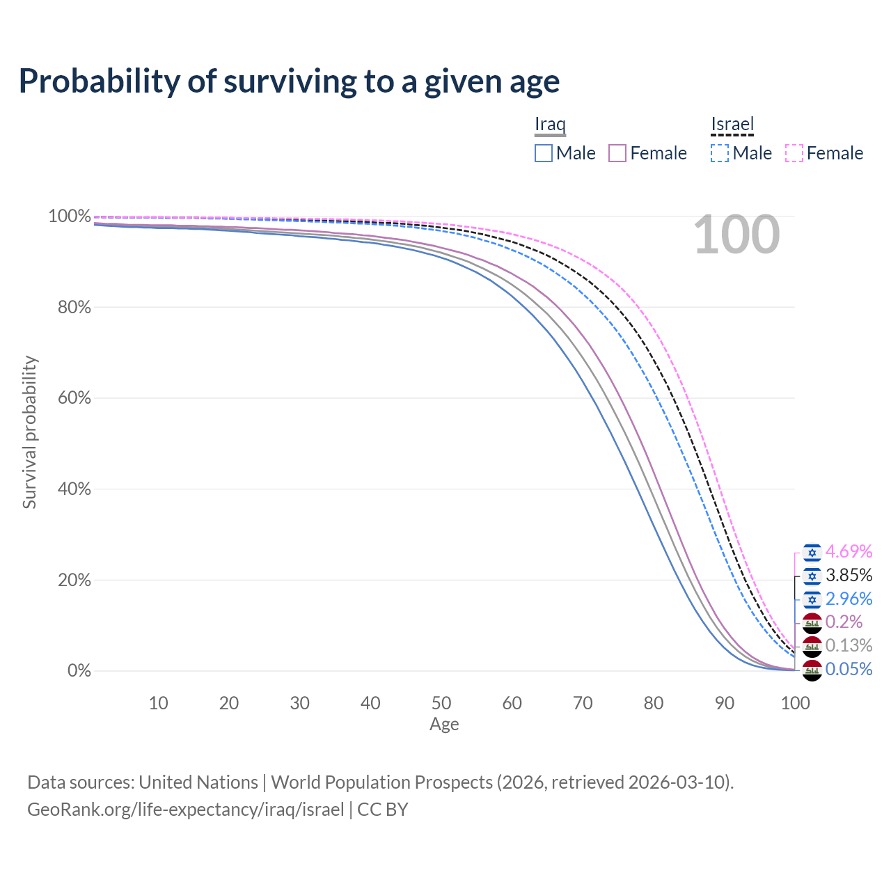 This life expectancy calculator shows the odds of living to 100, 95, 90, and below based on current age for both males and females in Iraq and Israel, along with mean and median age of death. The calculations are based on the 2026 life tables (actuarial tables) from the UN World Population Prospects.