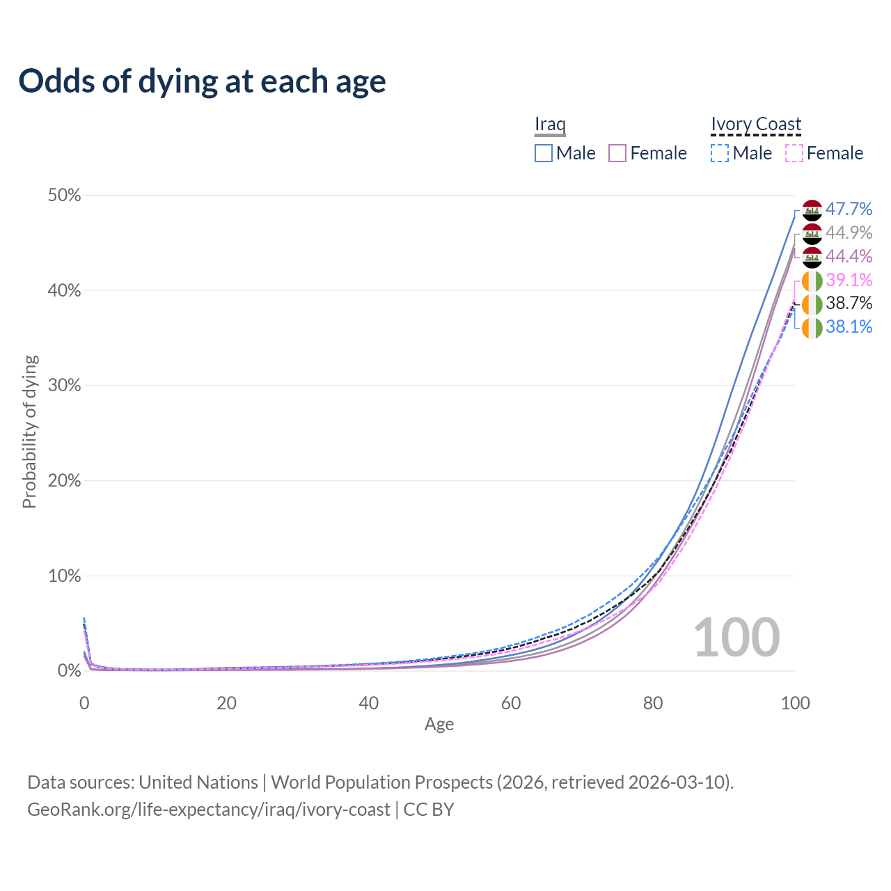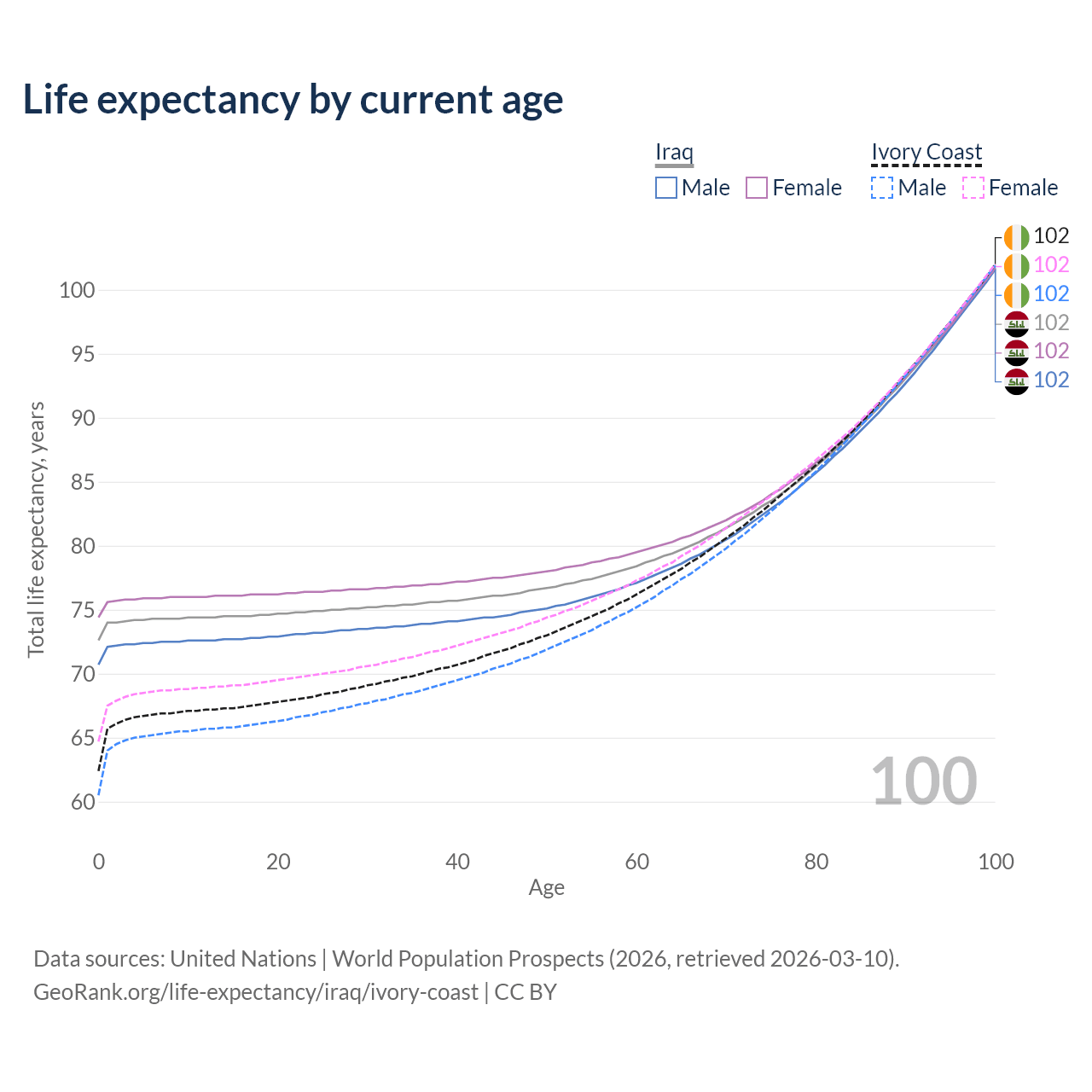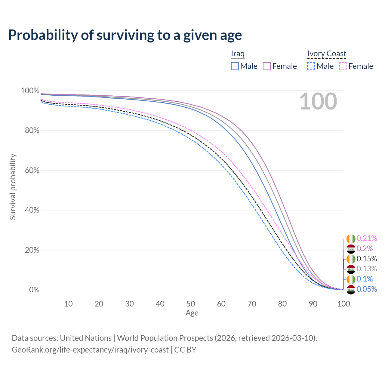 This life expectancy calculator shows the odds of living to 100, 95, 90, and below based on current age for both males and females in Iraq and Ivory Coast, along with mean and median age of death. The calculations are based on the 2026 life tables (actuarial tables) from the UN World Population Prospects.