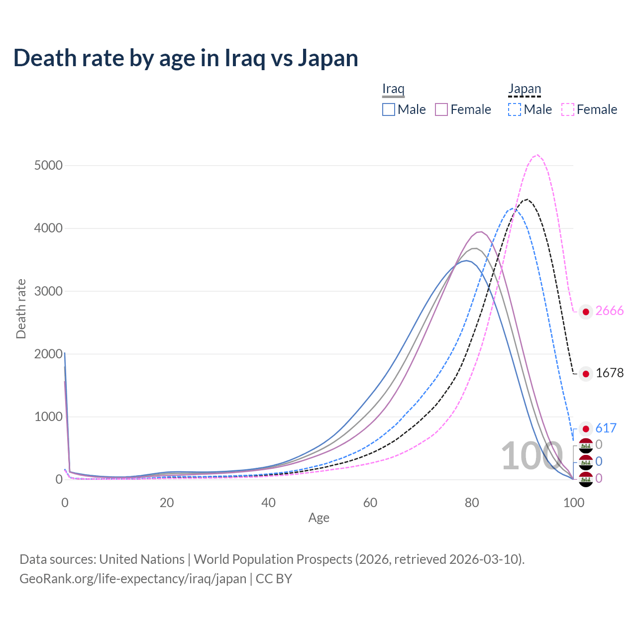 In Iraq, the most common age of death is 81, compared to 91 in Japan. The median age of death is 76.7 in Iraq and 88.1 in Japan, meaning only half of each cohort is expected to live past that age.