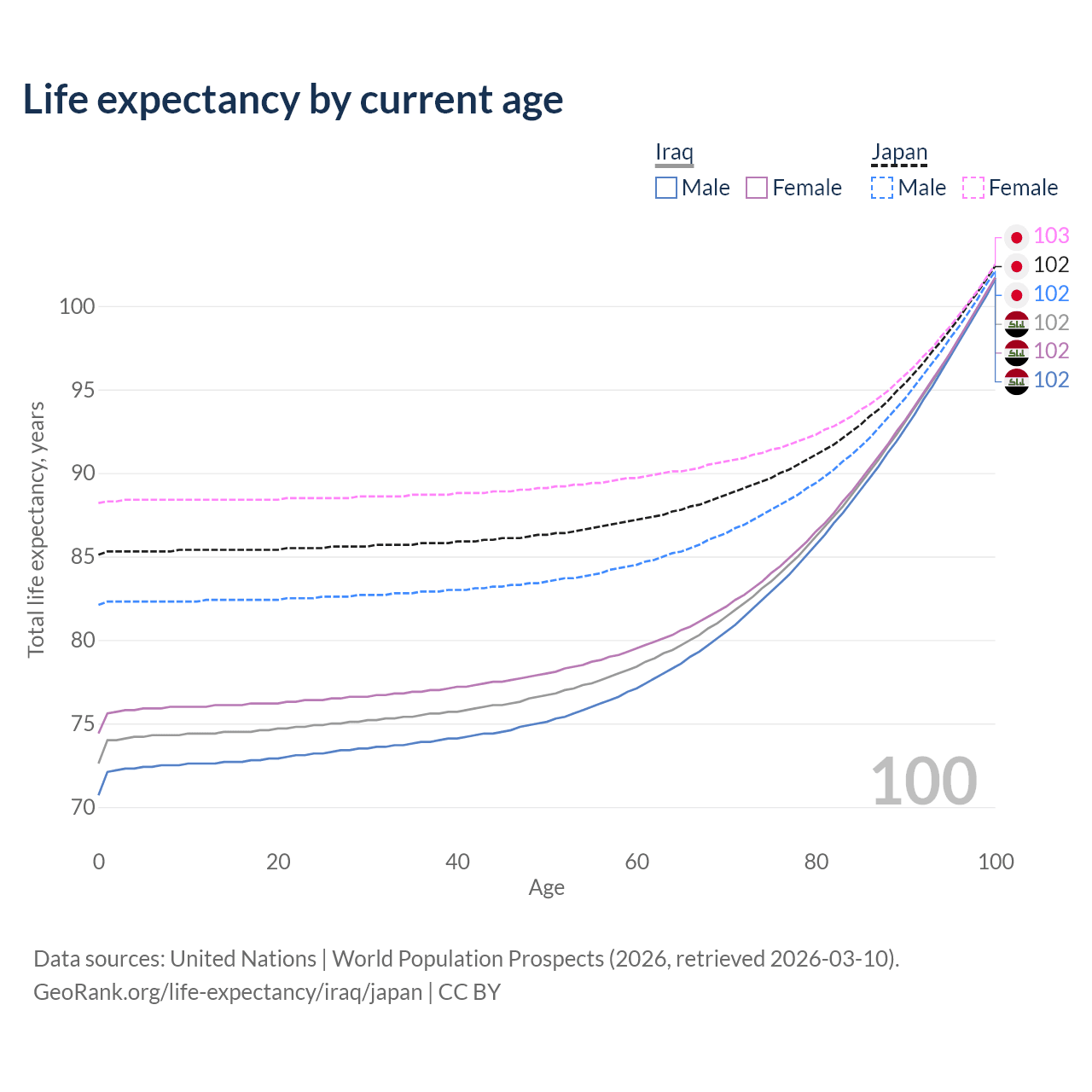 This life expectancy calculator shows the odds of living to 100, 95, 90, and below based on current age for both males and females in Iraq and Japan, along with mean and median age of death. The calculations are based on the 2026 life tables (actuarial tables) from the UN World Population Prospects.