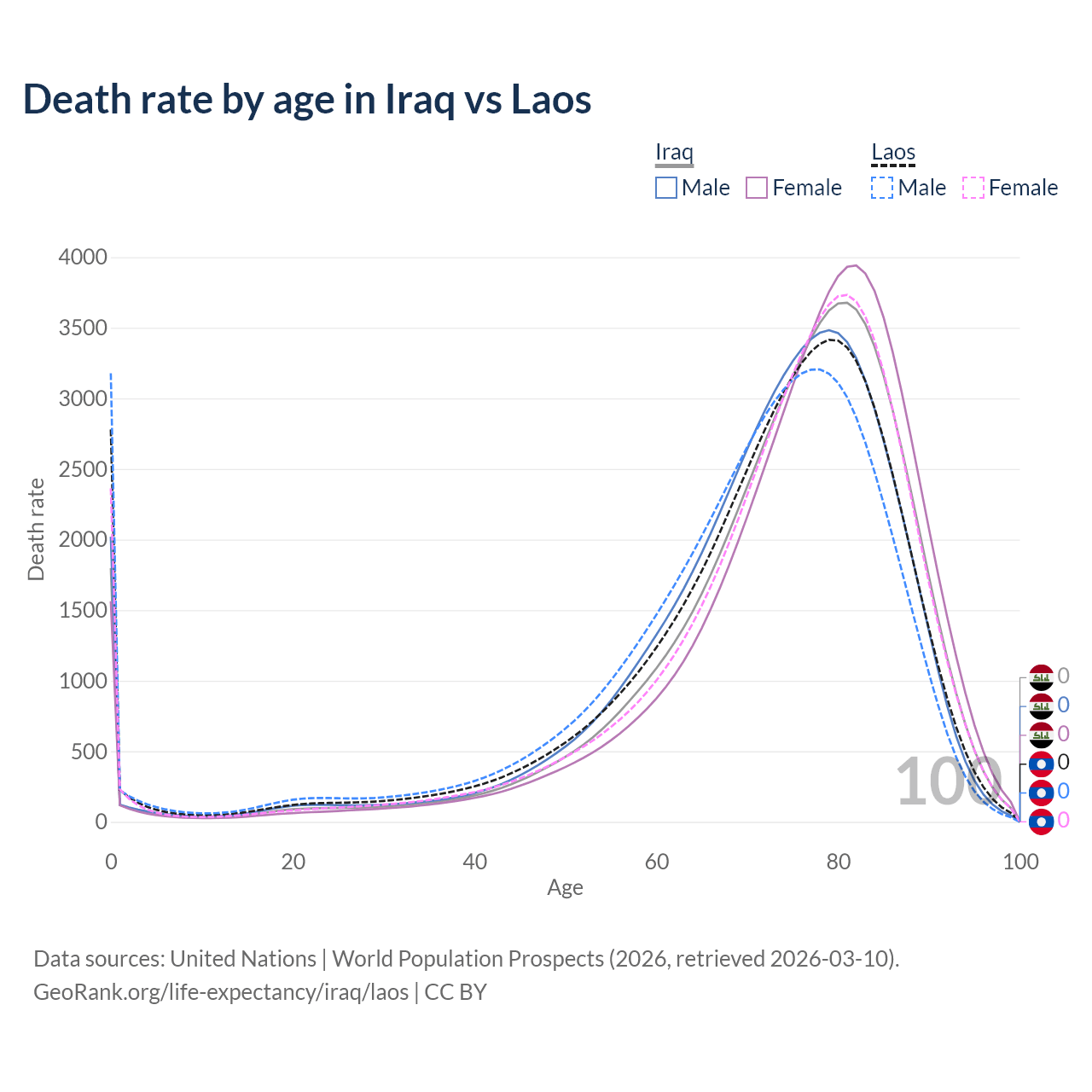 In Iraq, the most common age of death is 81, compared to 79 in Laos. The median age of death is 76.7 in Iraq and 74.7 in Laos, meaning only half of each cohort is expected to live past that age.