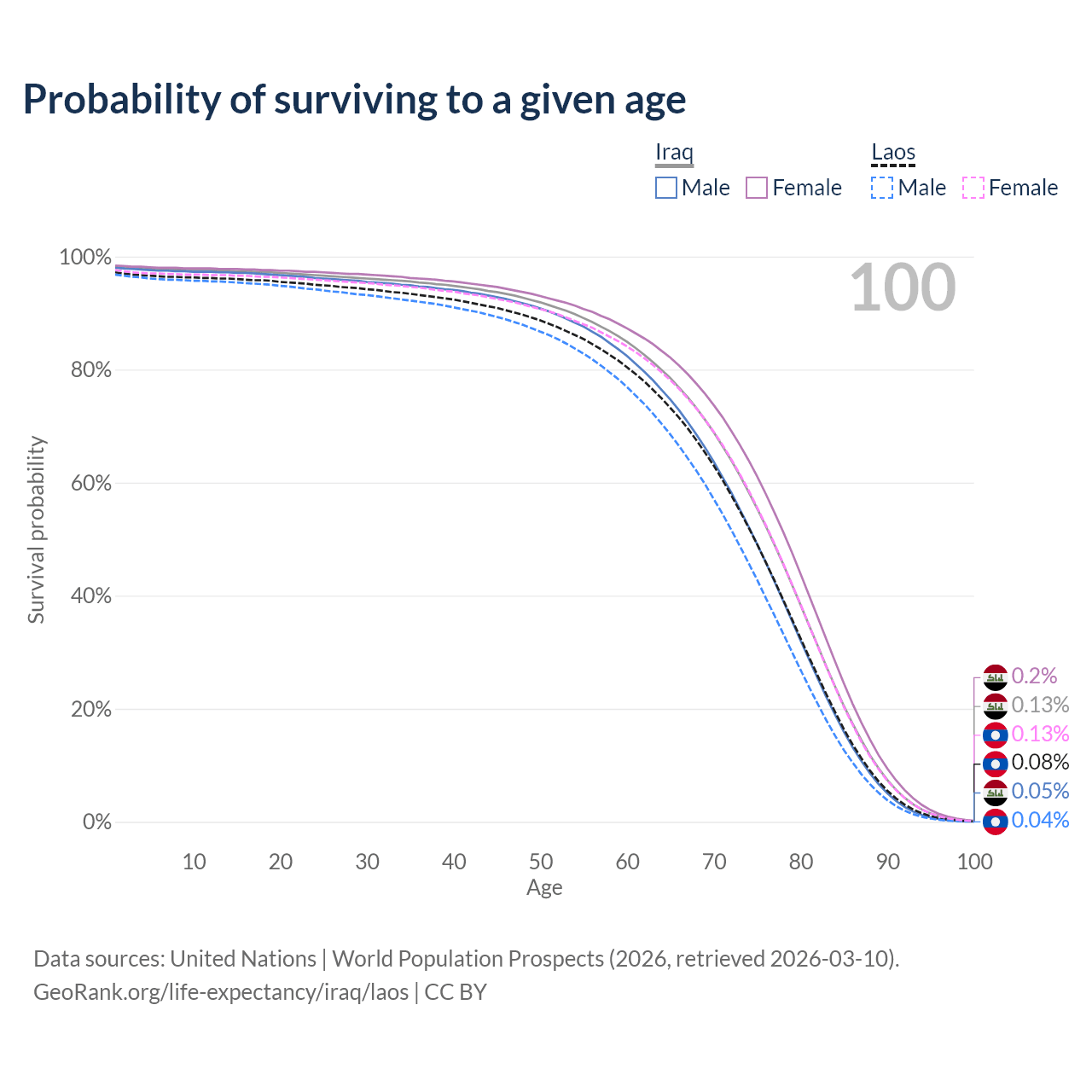This life expectancy calculator shows the odds of living to 100, 95, 90, and below based on current age for both males and females in Iraq and Laos, along with mean and median age of death. The calculations are based on the 2026 life tables (actuarial tables) from the UN World Population Prospects.