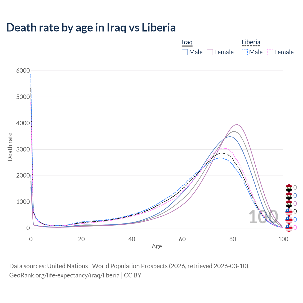 This life expectancy calculator shows the odds of living to 100, 95, 90, and below based on current age for both males and females in Iraq and Liberia, along with mean and median age of death. The calculations are based on the 2026 life tables (actuarial tables) from the UN World Population Prospects.