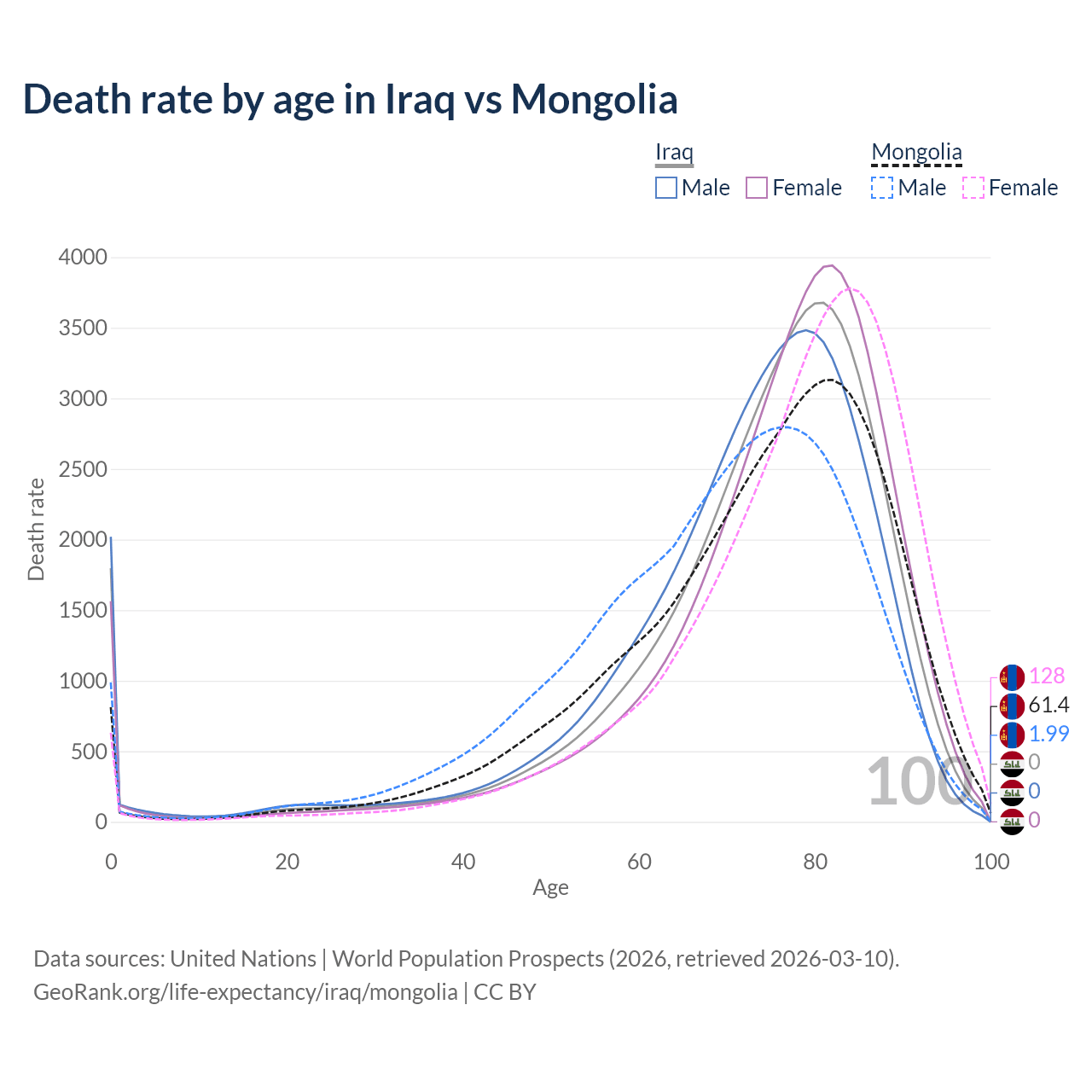 In Iraq, the most common age of death is 81, compared to 82 in Mongolia. The median age of death is 76.7 in Iraq and 76 in Mongolia, meaning only half of each cohort is expected to live past that age.