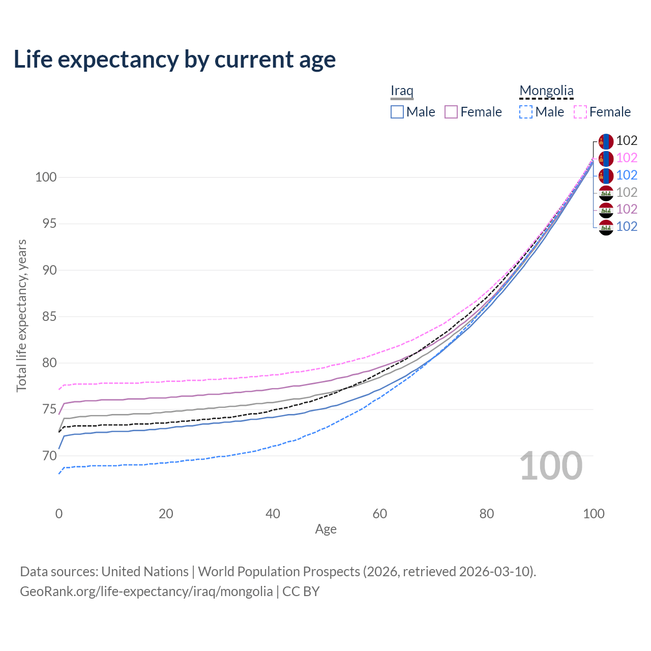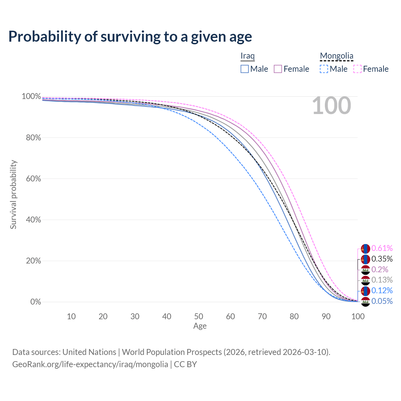 This life expectancy calculator shows the odds of living to 100, 95, 90, and below based on current age for both males and females in Iraq and Mongolia, along with mean and median age of death. The calculations are based on the 2026 life tables (actuarial tables) from the UN World Population Prospects.