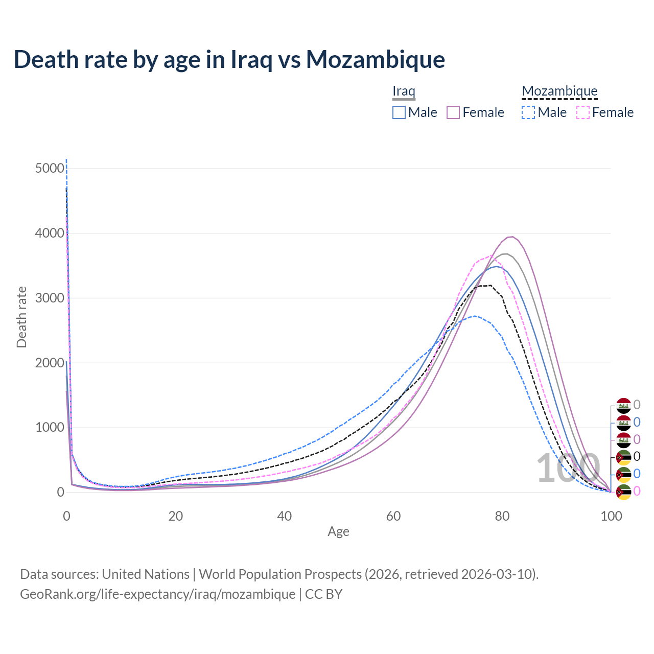 In Iraq, the most common age of death is 81, compared to 0 in Mozambique. The median age of death is 76.7 in Iraq and 71.2 in Mozambique, meaning only half of each cohort is expected to live past that age.
