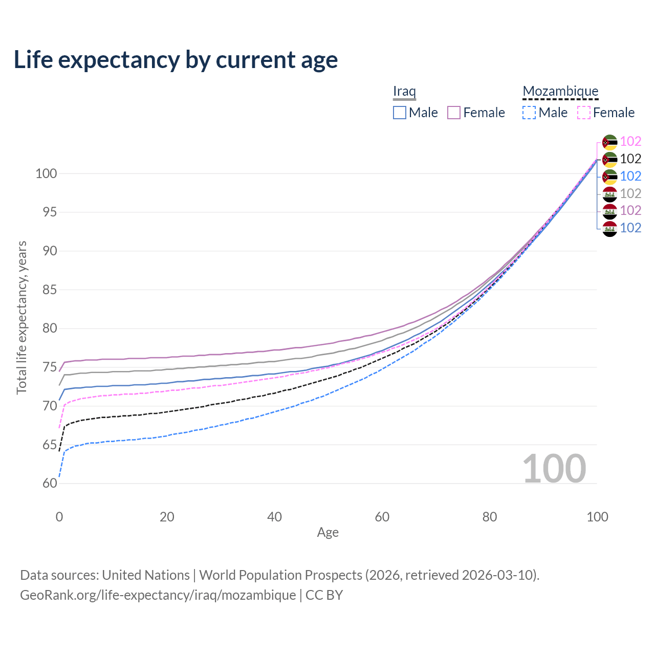 This life expectancy calculator shows the odds of living to 100, 95, 90, and below based on current age for both males and females in Iraq and Mozambique, along with mean and median age of death. The calculations are based on the 2026 life tables (actuarial tables) from the UN World Population Prospects.