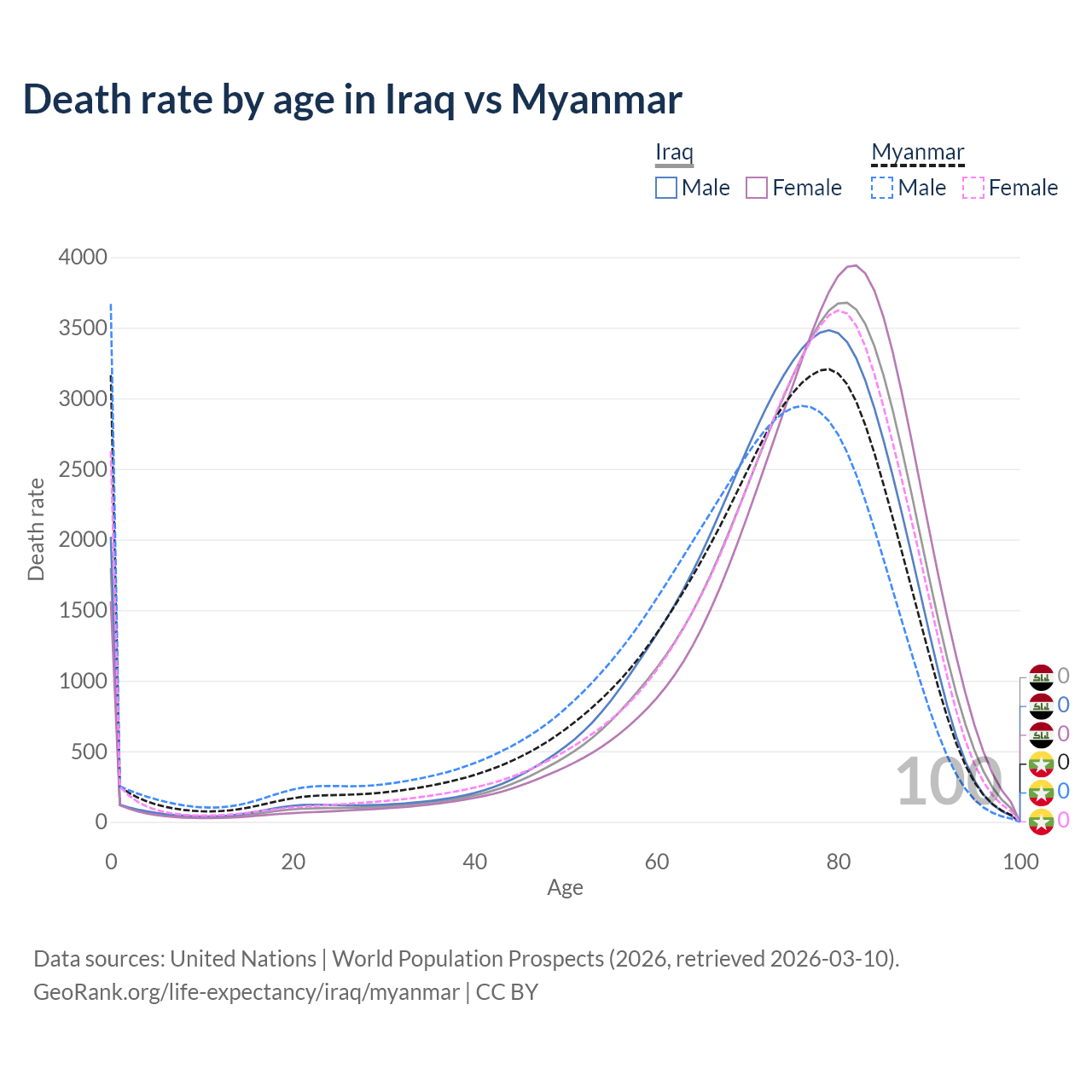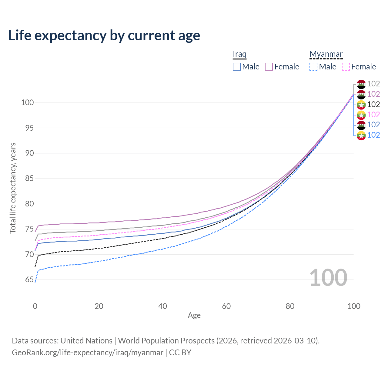 This life expectancy calculator shows the odds of living to 100, 95, 90, and below based on current age for both males and females in Iraq and Myanmar, along with mean and median age of death. The calculations are based on the 2026 life tables (actuarial tables) from the UN World Population Prospects.