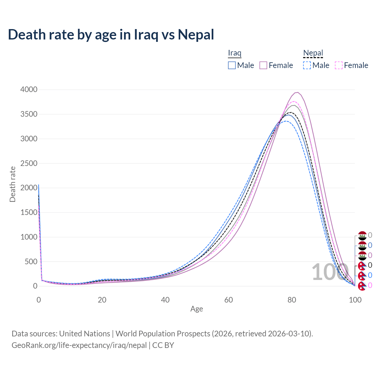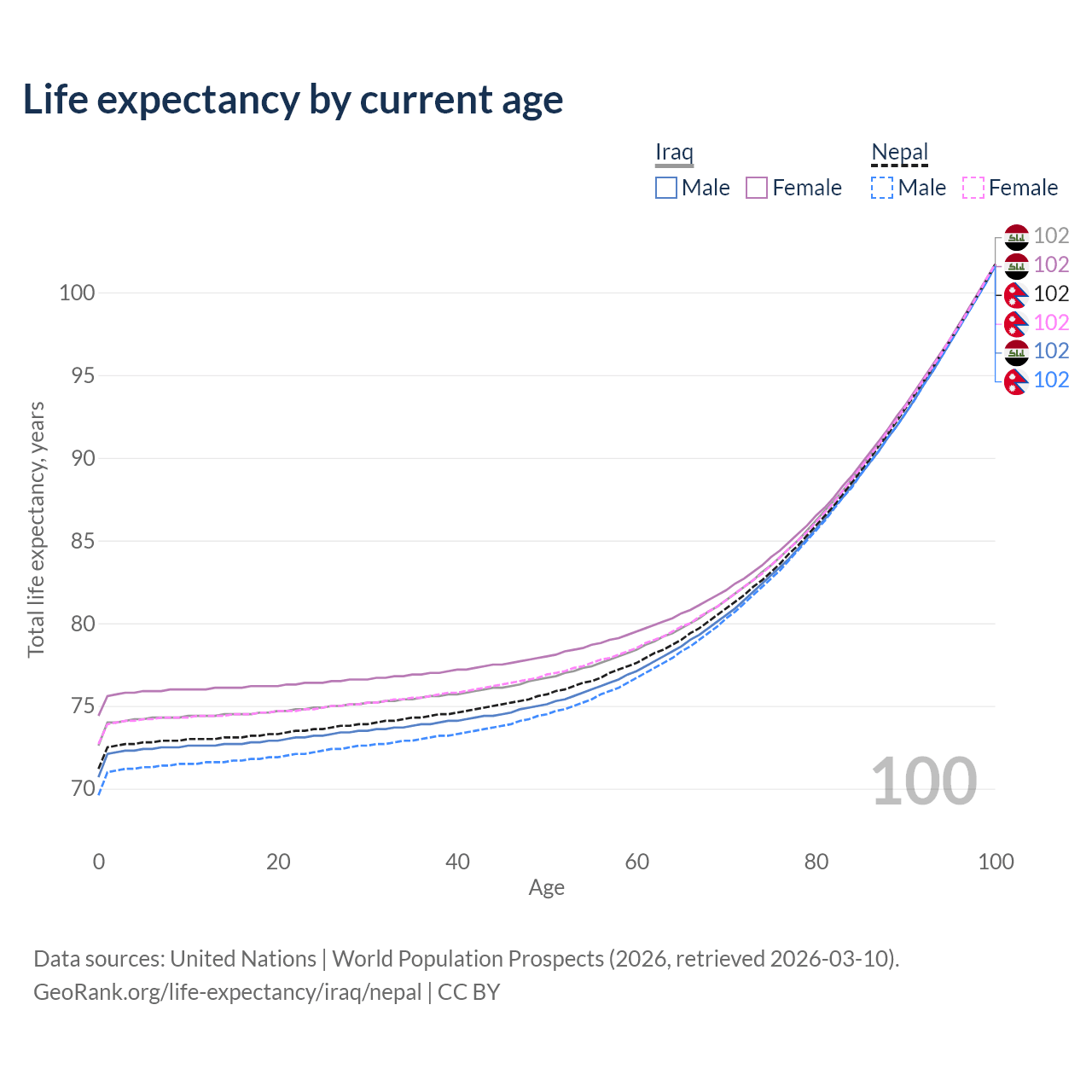 This life expectancy calculator shows the odds of living to 100, 95, 90, and below based on current age for both males and females in Iraq and Nepal, along with mean and median age of death. The calculations are based on the 2026 life tables (actuarial tables) from the UN World Population Prospects.