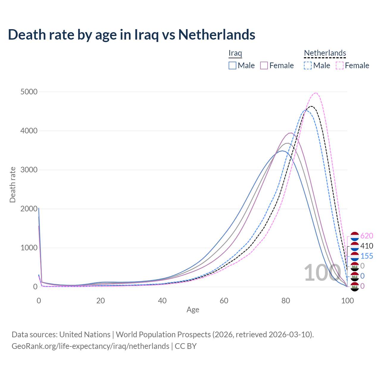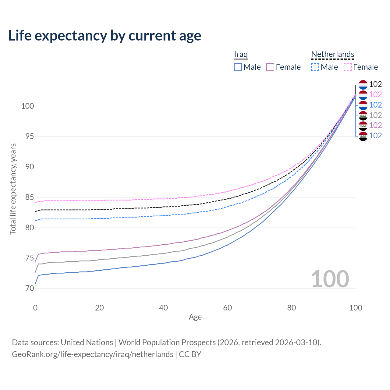 This life expectancy calculator shows the odds of living to 100, 95, 90, and below based on current age for both males and females in Iraq and the Netherlands, along with mean and median age of death. The calculations are based on the 2026 life tables (actuarial tables) from the UN World Population Prospects.