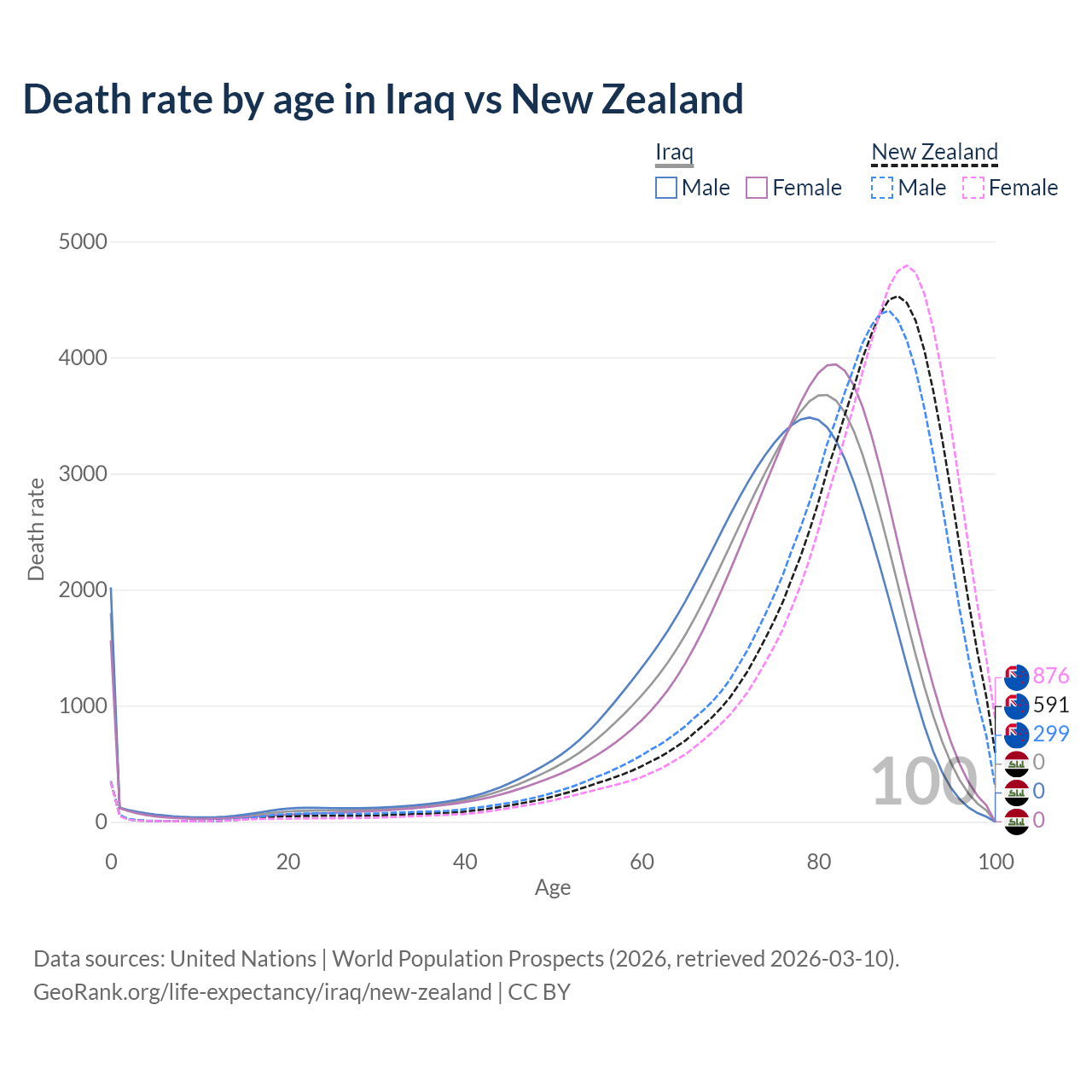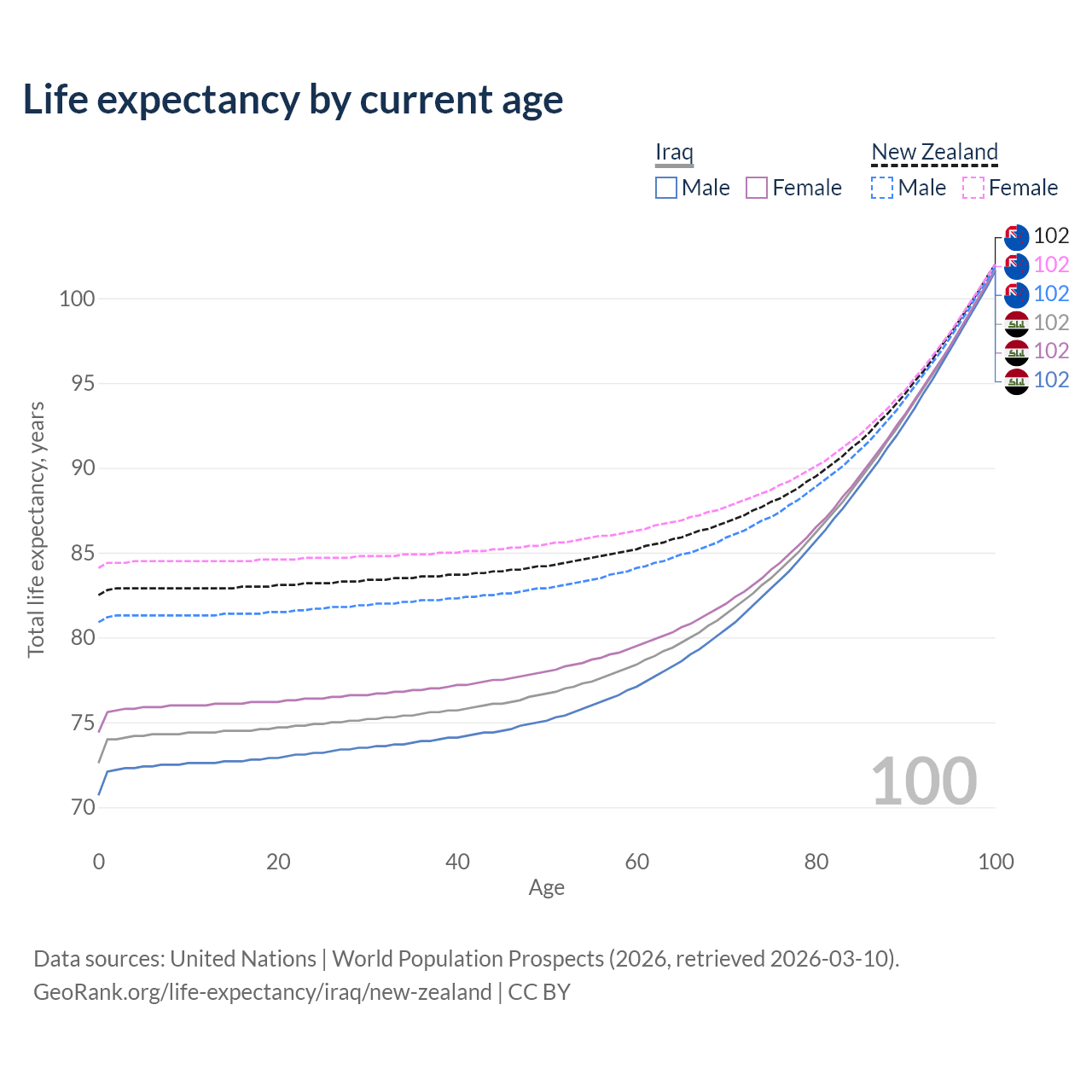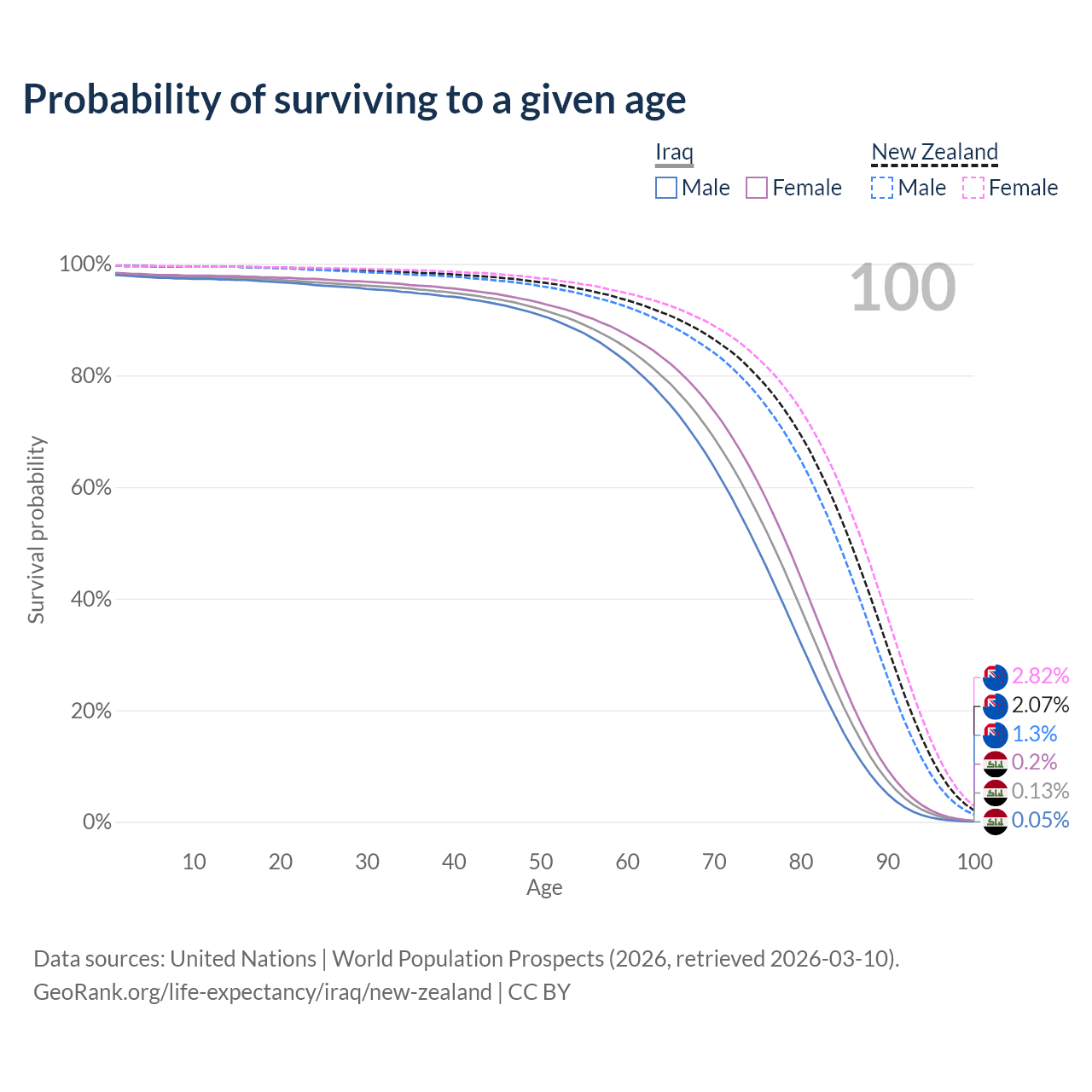 This life expectancy calculator shows the odds of living to 100, 95, 90, and below based on current age for both males and females in Iraq and New Zealand, along with mean and median age of death. The calculations are based on the 2026 life tables (actuarial tables) from the UN World Population Prospects.