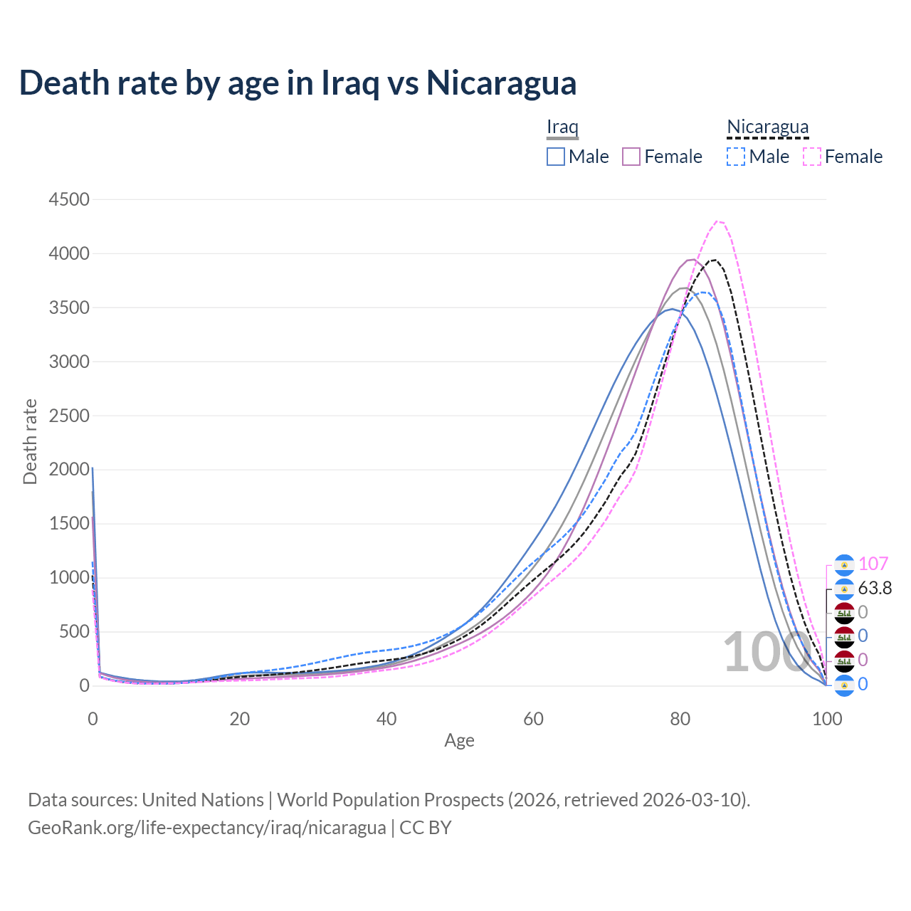 In Iraq, the most common age of death is 81, compared to 85 in Nicaragua. The median age of death is 76.7 in Iraq and 79.9 in Nicaragua, meaning only half of each cohort is expected to live past that age.