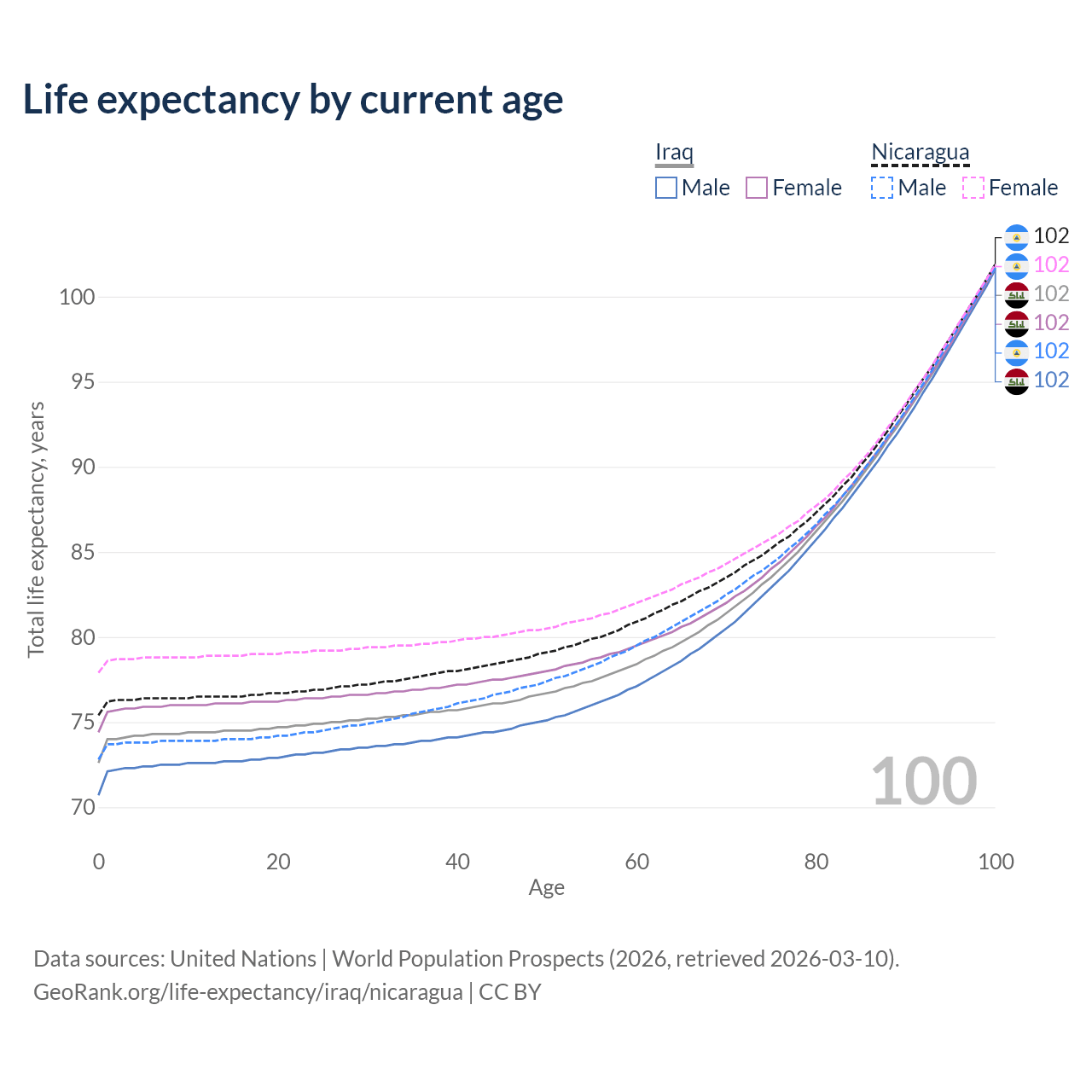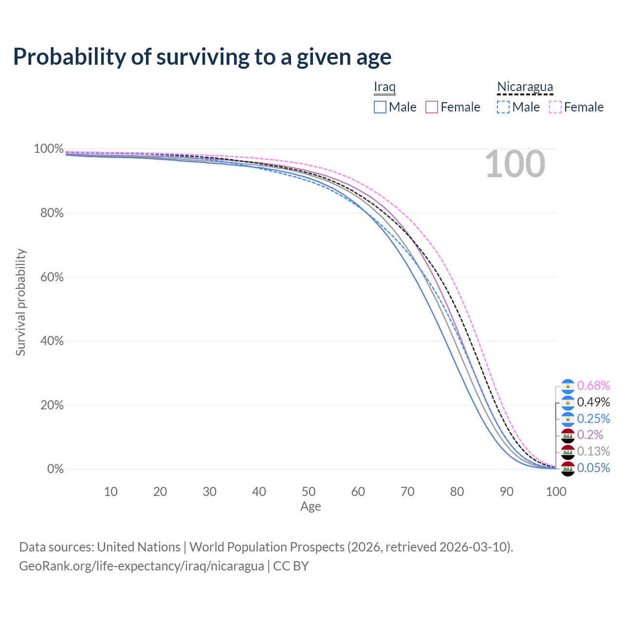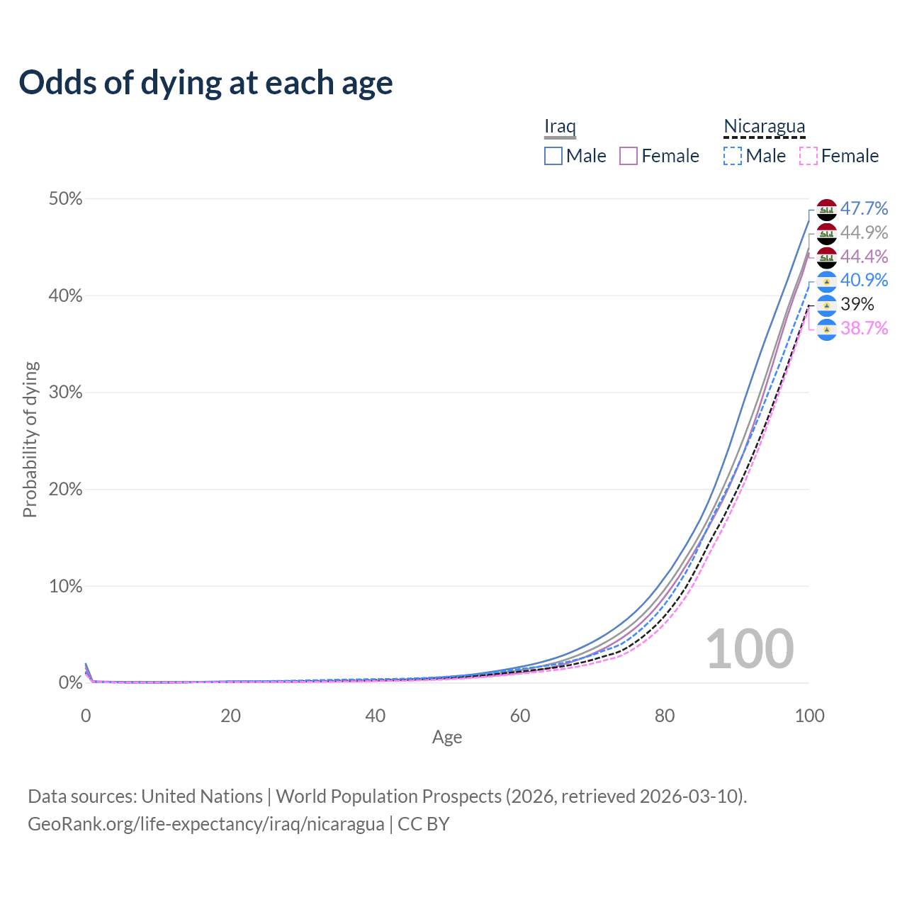 This life expectancy calculator shows the odds of living to 100, 95, 90, and below based on current age for both males and females in Iraq and Nicaragua, along with mean and median age of death. The calculations are based on the 2026 life tables (actuarial tables) from the UN World Population Prospects.