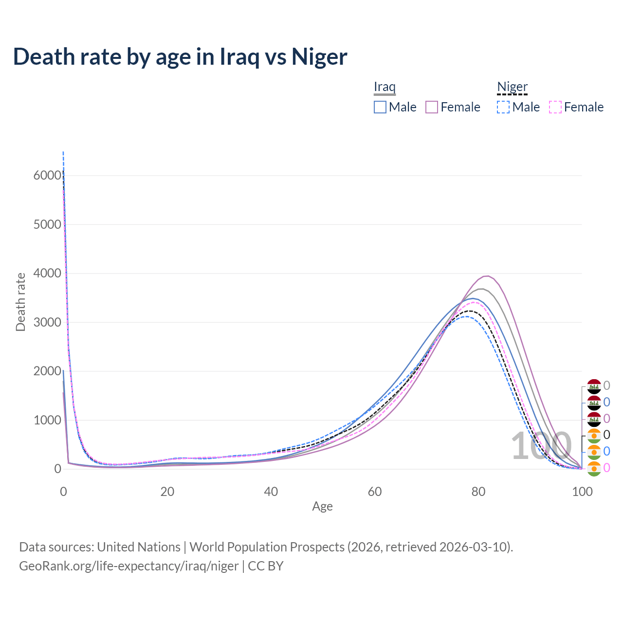 In Iraq, the most common age of death is 81, compared to 0 in Niger. The median age of death is 76.7 in Iraq and 71.7 in Niger, meaning only half of each cohort is expected to live past that age.