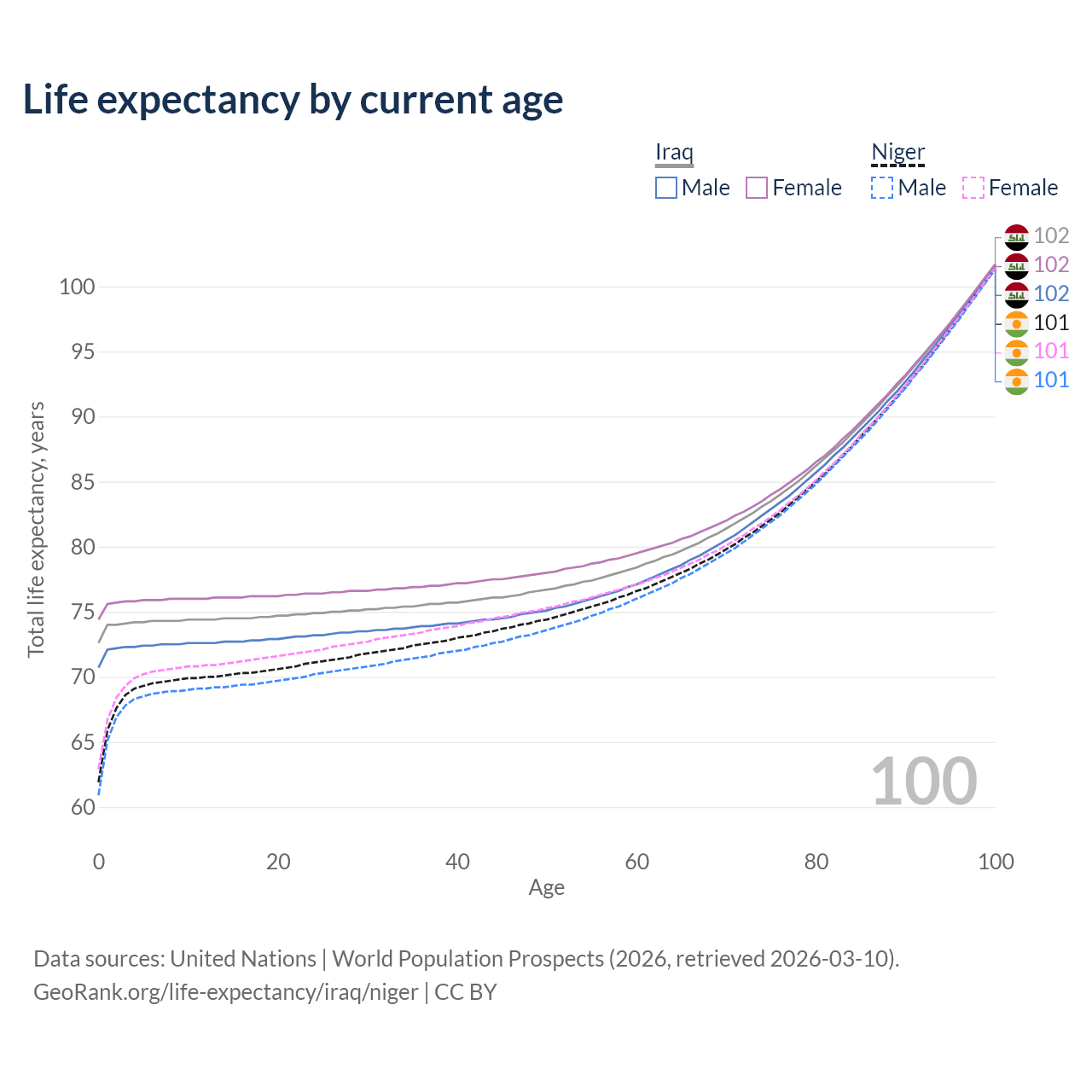 This life expectancy calculator shows the odds of living to 100, 95, 90, and below based on current age for both males and females in Iraq and Niger, along with mean and median age of death. The calculations are based on the 2026 life tables (actuarial tables) from the UN World Population Prospects.