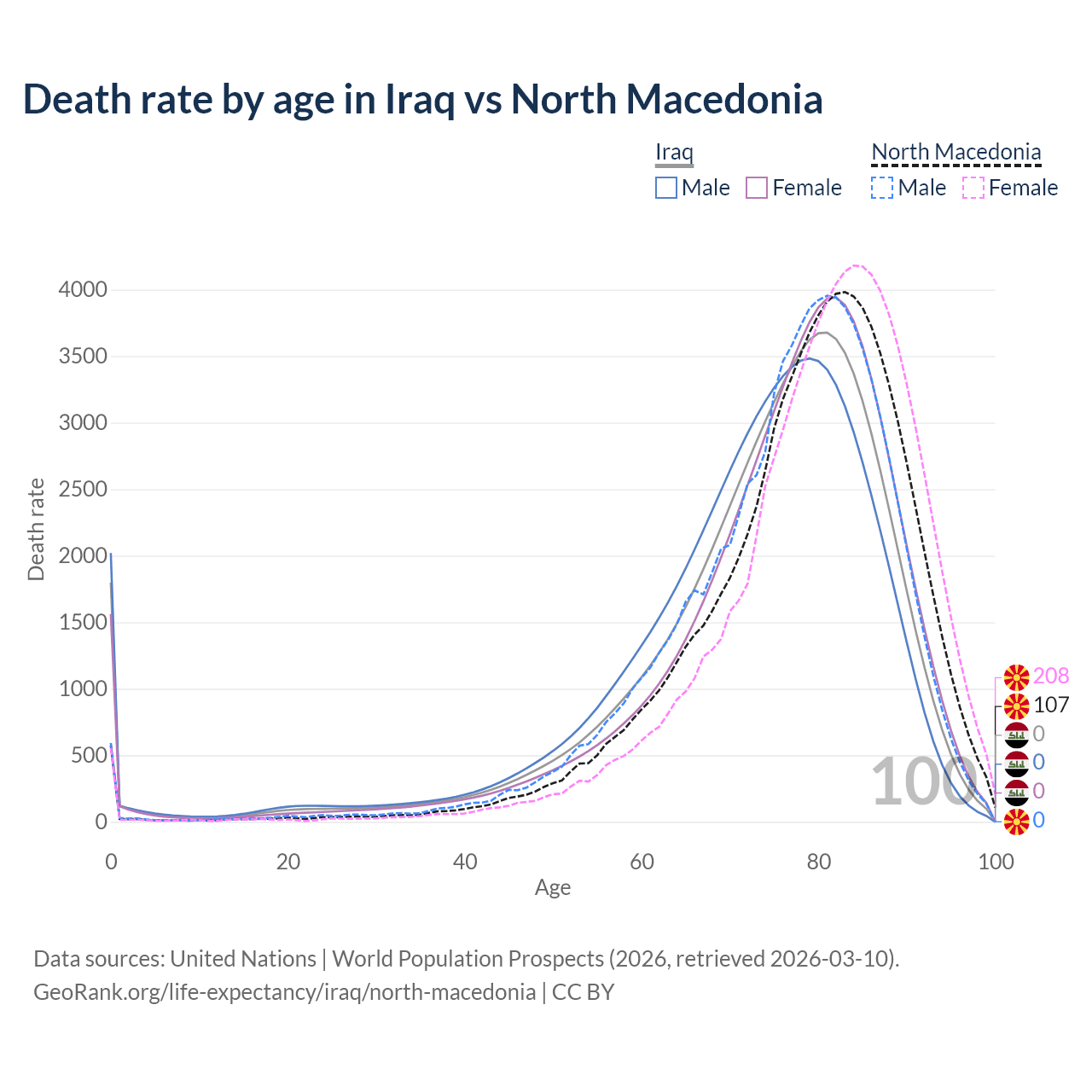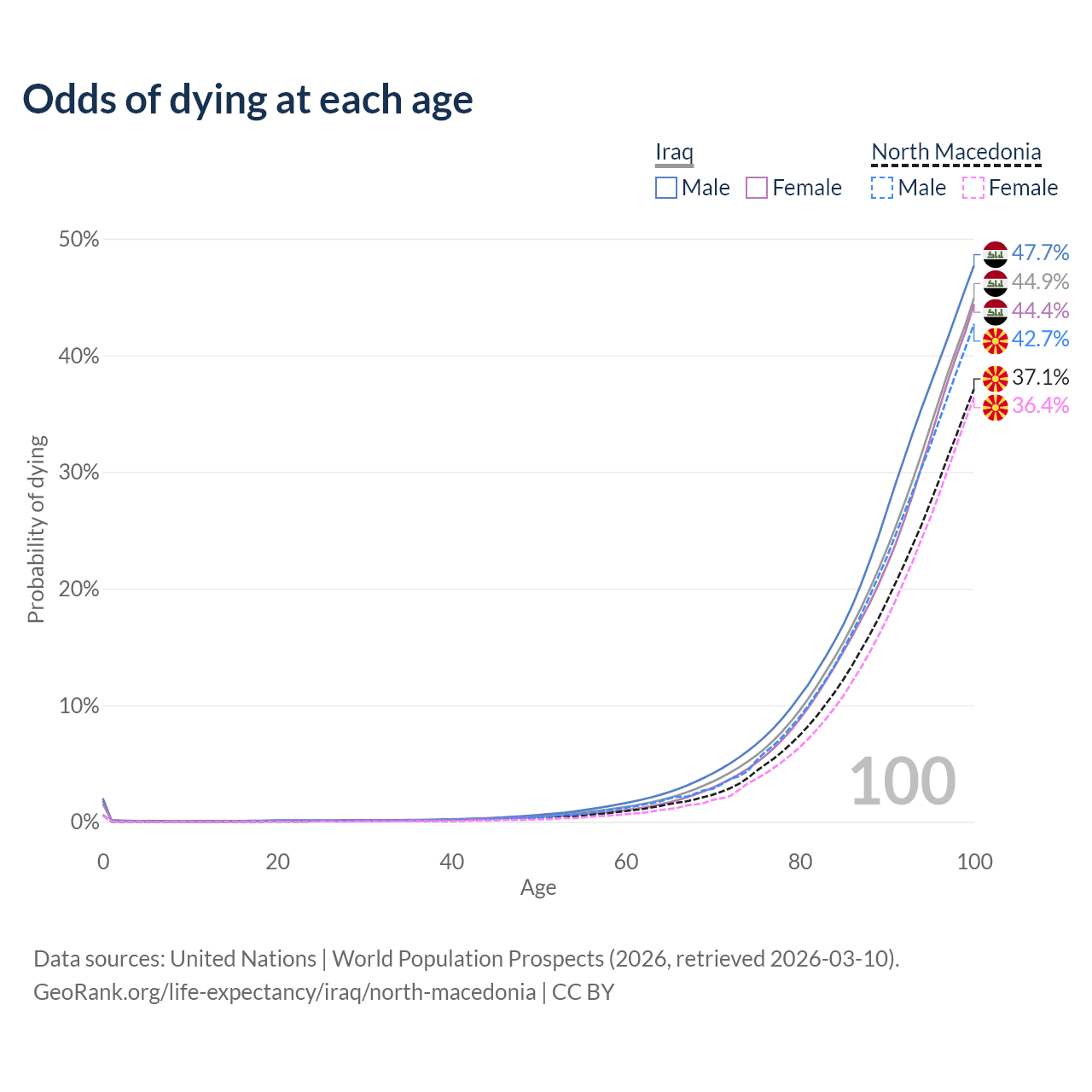 This life expectancy calculator shows the odds of living to 100, 95, 90, and below based on current age for both males and females in Iraq and North Macedonia, along with mean and median age of death. The calculations are based on the 2026 life tables (actuarial tables) from the UN World Population Prospects.