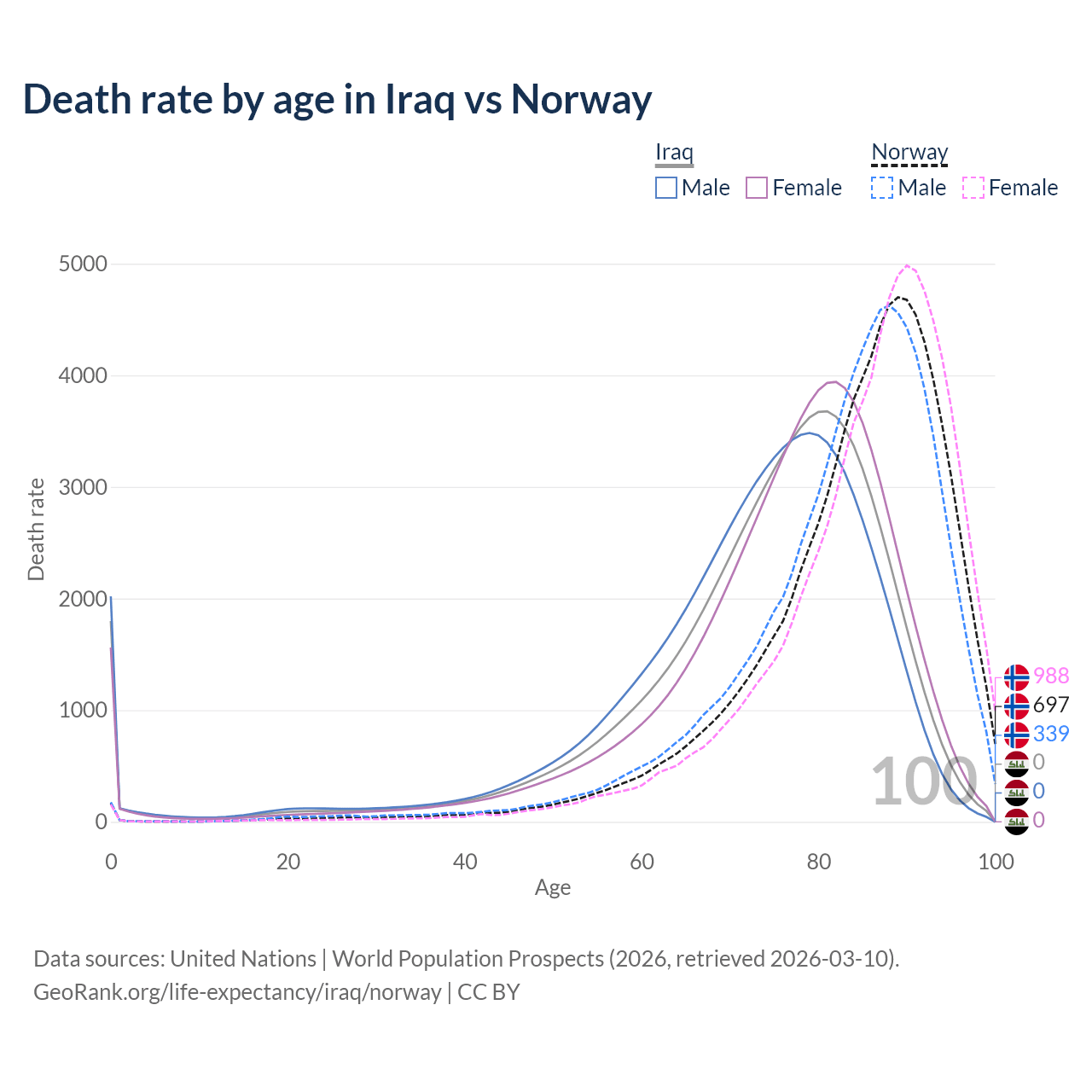 In Iraq, the most common age of death is 81, compared to 89 in Norway. The median age of death is 76.7 in Iraq and 86.5 in Norway, meaning only half of each cohort is expected to live past that age.
