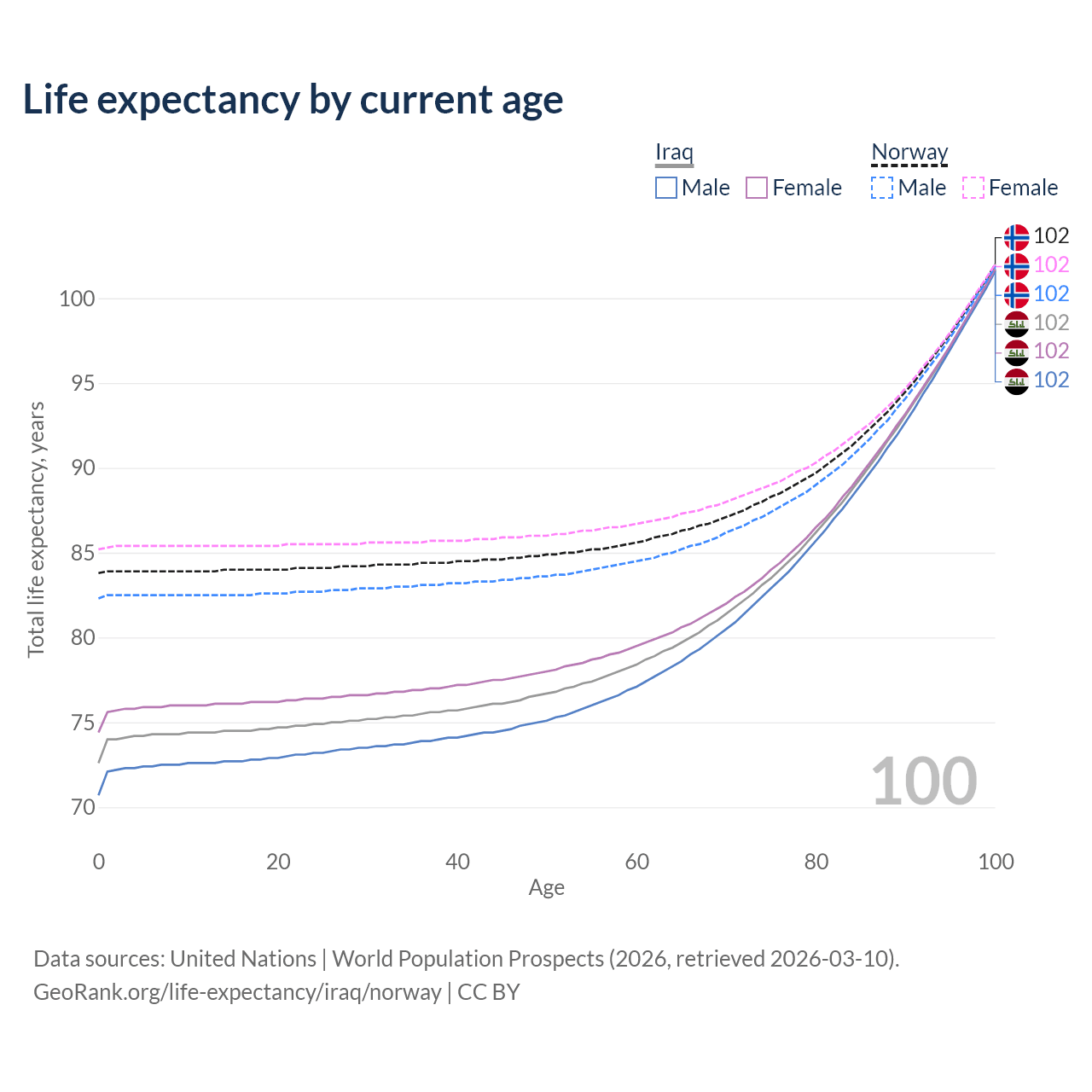 This life expectancy calculator shows the odds of living to 100, 95, 90, and below based on current age for both males and females in Iraq and Norway, along with mean and median age of death. The calculations are based on the 2026 life tables (actuarial tables) from the UN World Population Prospects.