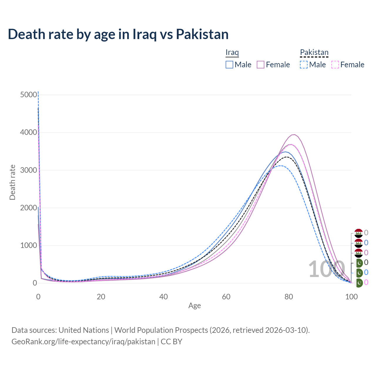 In Iraq, the most common age of death is 81, compared to 0 in Pakistan. The median age of death is 76.7 in Iraq and 74.3 in Pakistan, meaning only half of each cohort is expected to live past that age.