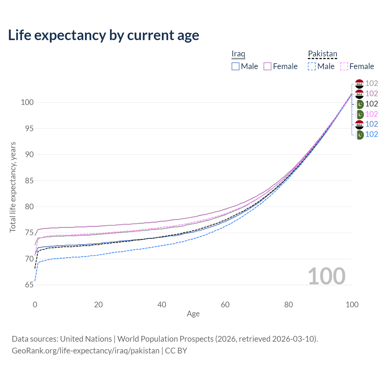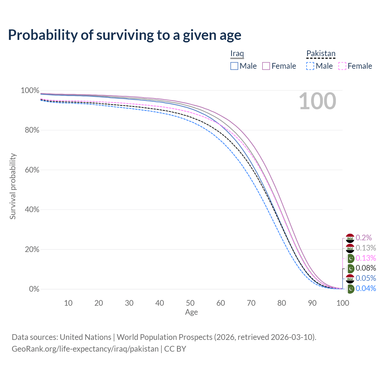 This life expectancy calculator shows the odds of living to 100, 95, 90, and below based on current age for both males and females in Iraq and Pakistan, along with mean and median age of death. The calculations are based on the 2026 life tables (actuarial tables) from the UN World Population Prospects.