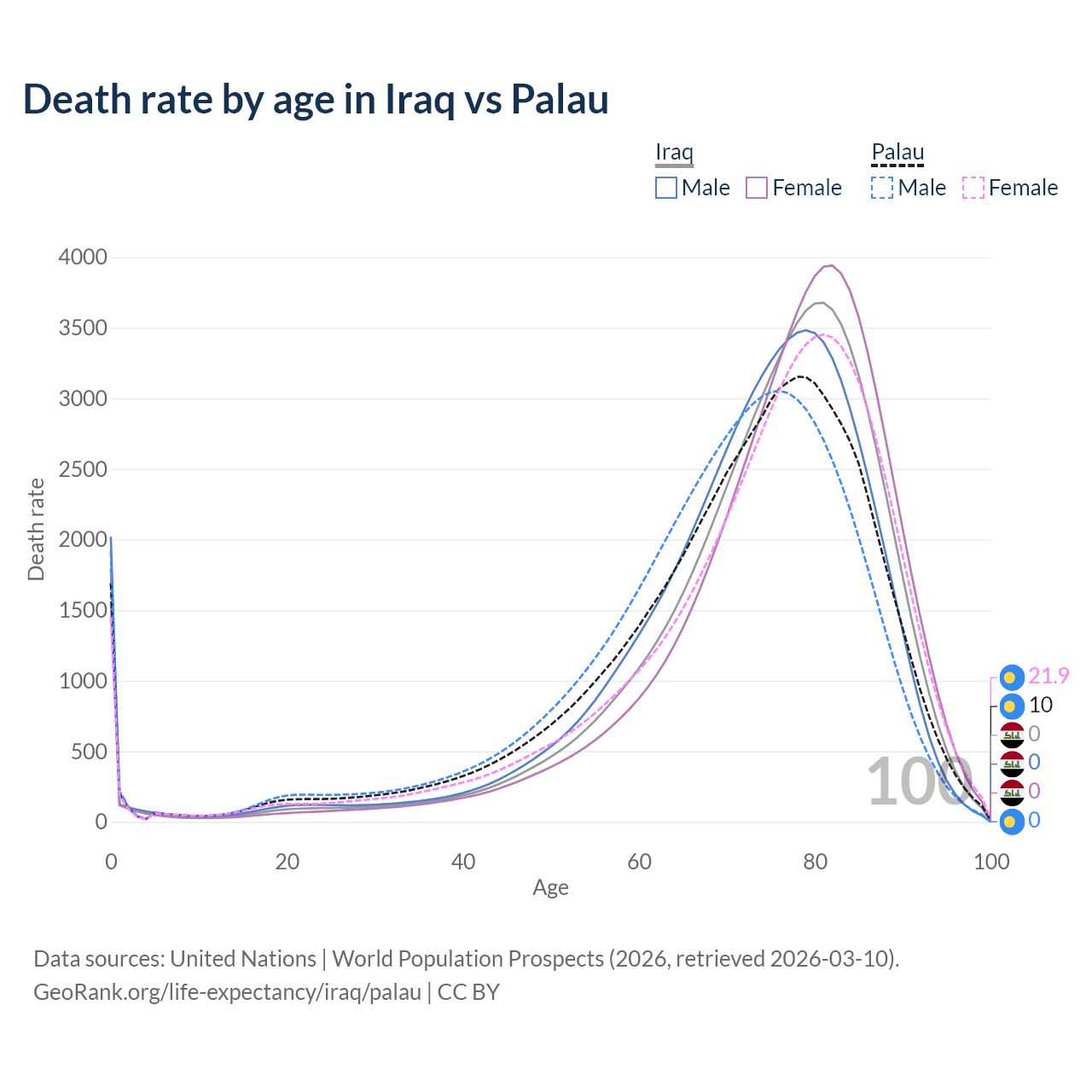In Iraq, the most common age of death is 81, compared to 78 in Palau. The median age of death is 76.7 in Iraq and 73.8 in Palau, meaning only half of each cohort is expected to live past that age.