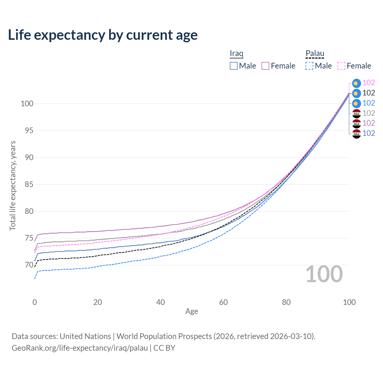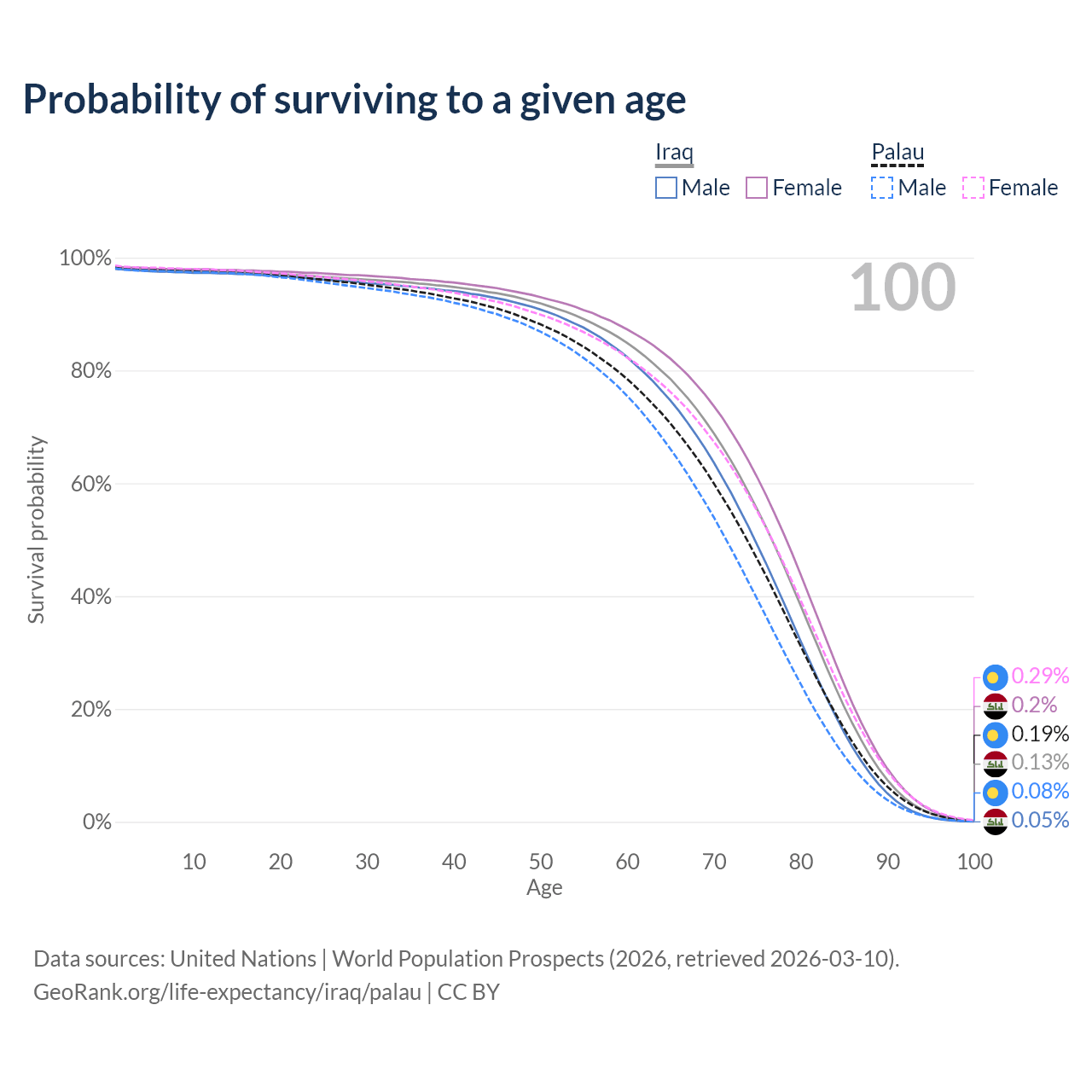 This life expectancy calculator shows the odds of living to 100, 95, 90, and below based on current age for both males and females in Iraq and Palau, along with mean and median age of death. The calculations are based on the 2026 life tables (actuarial tables) from the UN World Population Prospects.