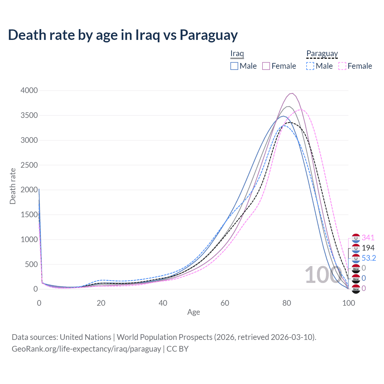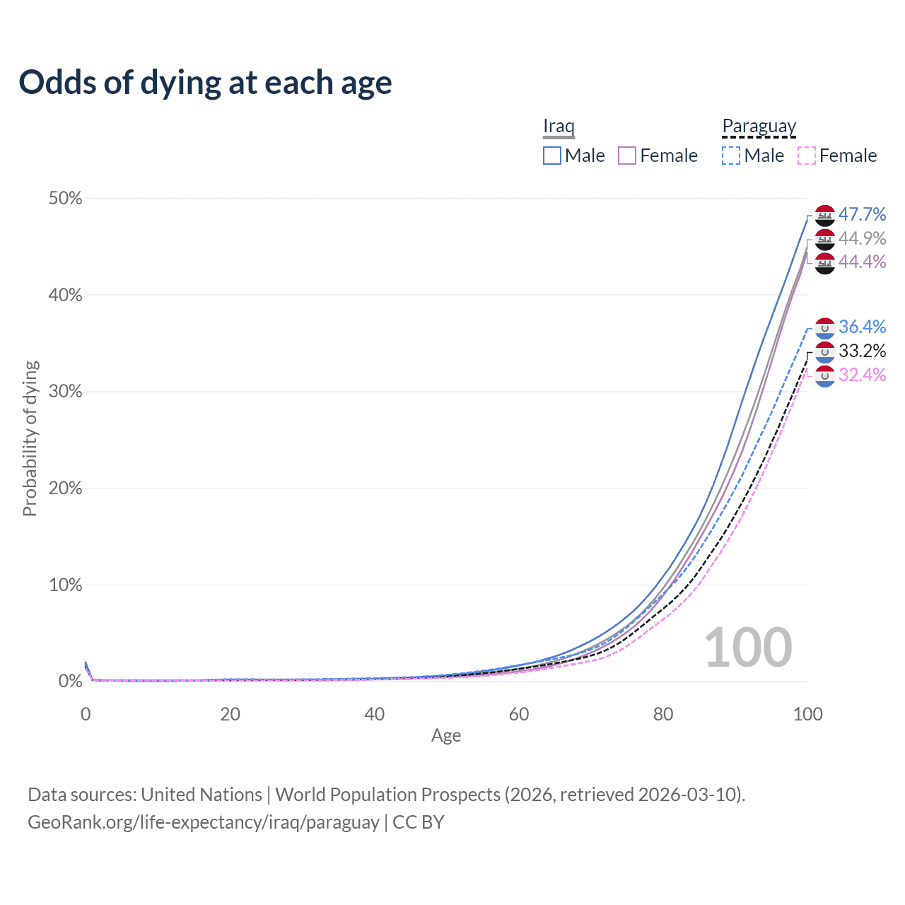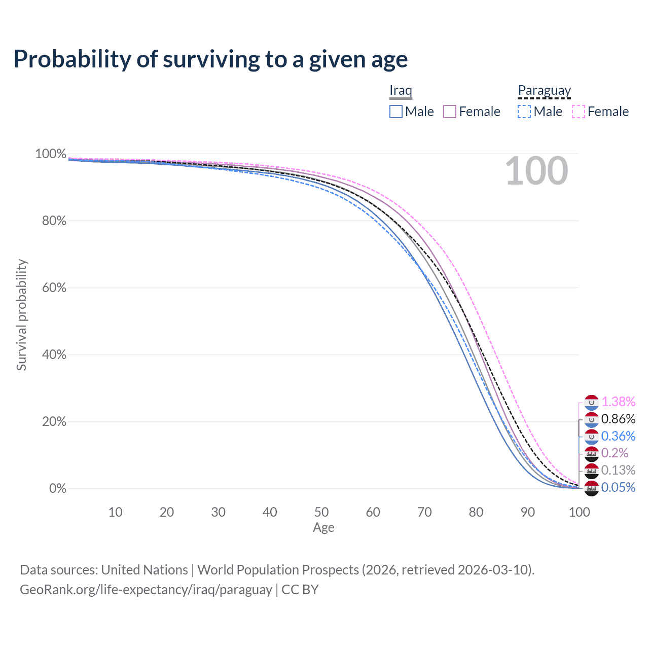This life expectancy calculator shows the odds of living to 100, 95, 90, and below based on current age for both males and females in Iraq and Paraguay, along with mean and median age of death. The calculations are based on the 2026 life tables (actuarial tables) from the UN World Population Prospects.