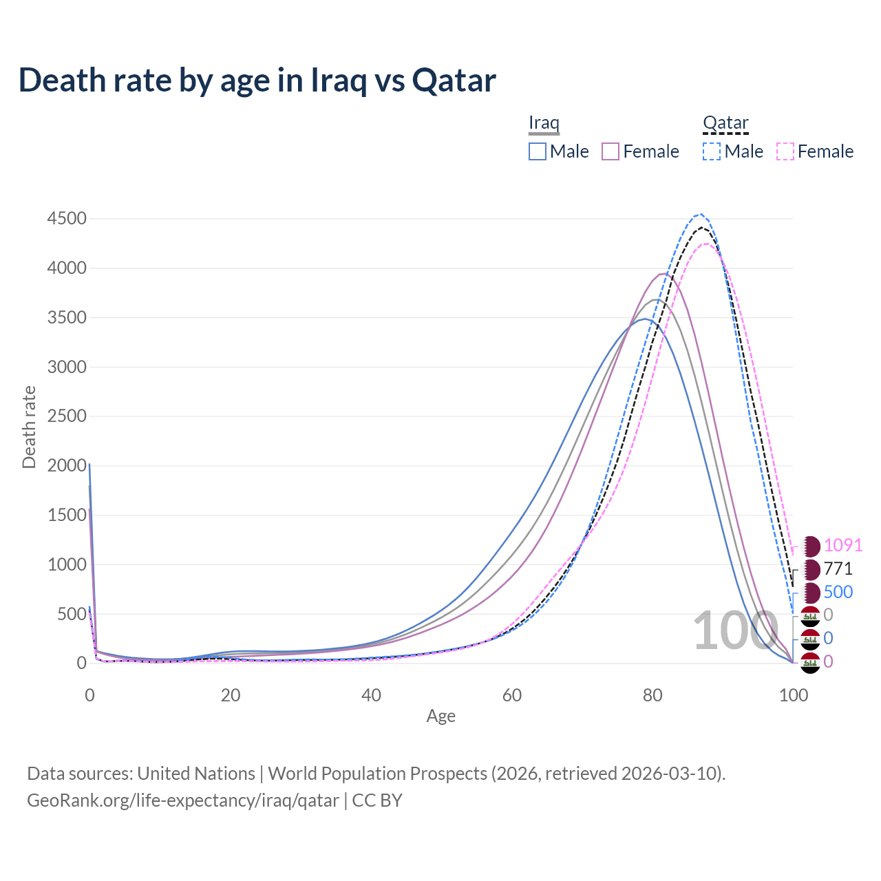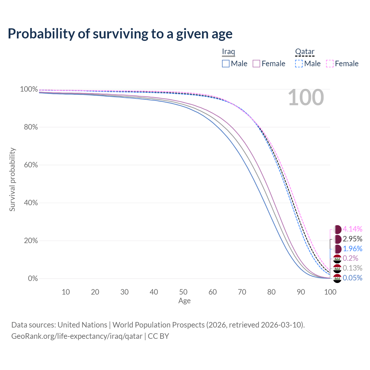 This life expectancy calculator shows the odds of living to 100, 95, 90, and below based on current age for both males and females in Iraq and Qatar, along with mean and median age of death. The calculations are based on the 2026 life tables (actuarial tables) from the UN World Population Prospects.